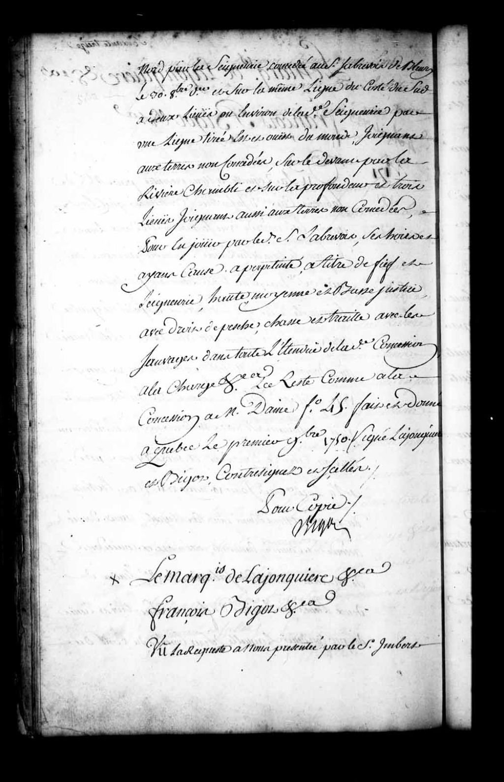Acte de concession par Jacques-Pierre de Taffanel, Marquis de la Jonquière, et François Bigot, gouverneur et intendant de la Nouvelle-France, au sieur Imbert, trésorier de la Marine en ce pays, d'un terrain de soixante pieds de front sur soixante pieds de profondeur sis rue Saint-Pierre en la Basse-Ville de Québec, joignant l'emplacement du sieur Estebe, conseiller Conseil supérieur de Québec, lequel terrain avait auparavant été concédé au sieur François Pachot et réuni au Domaine de Sa Majesté par le présent acte, avec une augmentation d'une profondeur de soixante pieds, à titre de cens et rentes