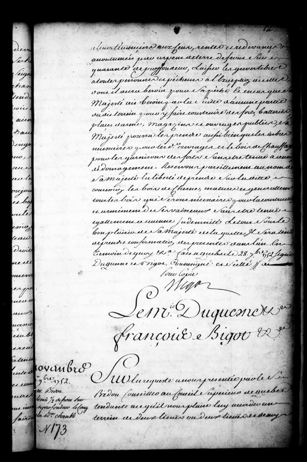Acte de concession par Ange Duquesne, Marquis de Menneville, et François Bigot, gouverneur et intendant de la Nouvelle-France, au sieur Bedou (Bedout, Bedon), conseiller au Conseil supérieur de Québec, d'un terrain de deux lieues ou deux lieues et demie de front sur trois lieues de profondeur situé le long de la rivière Chambly (Richelieu) et du lac Champlain, avec la rivière Chazy y comprise, le front dudit terrain à prendre depuis la borne de la seigneurie nouvellement concédée au sieur de Beaujeu jusqu'à une lieue de l'embouchure de la rivière Chazy du côté du sud, avec la partie de la rivière Chazy se trouvant dans l'étendue dudit terrain, lequel sera borné par une ligne nord et sud passant par l'embouchure de ladite rivière Chazy, sur trois lieues de profondeur, et laquelle concession comprenant en outre tout ledit terrain se trouvant au-delà de ladite ligne sur la rivière Chambly et le lac Champlain, avec l'île à Lamothe, située vis-à-vis dans ledit lac, laquelle concession ayant auparavant été accordée au feu sieur Péan, de son vivant major de Québec, et ayant été réunie au Domaine du Roi par une ordonnance de Charles de Boische, Marquis de Beauharnois, et Gilles Hocquart, alors gouverneur et intendant, en date du 10 mai 1741, le tout à titre de fief et seigneurie avec haute, moyenne et basse justiceois Bigot, gouverneur et intendant de la Nouvelle-France, à Jacques-Pierre Daneau, sieur DeMuy (DeMuy), capitaine d'infanterie en Canada, d'une étendue de terrain de trois lieues de front sur quatre de profondeur donnant sur le lac Champlain, à prendre depuis la grande rivière aux Loutres, celle-ci étant comprise dans les limites de la concession, en descendant au nord-est le long dudit lac Champlain, avec les îles et îlets se trouvant au-devant de ladite concession, à titre de fief et seigneurie avec haute, moyenne et basse justice