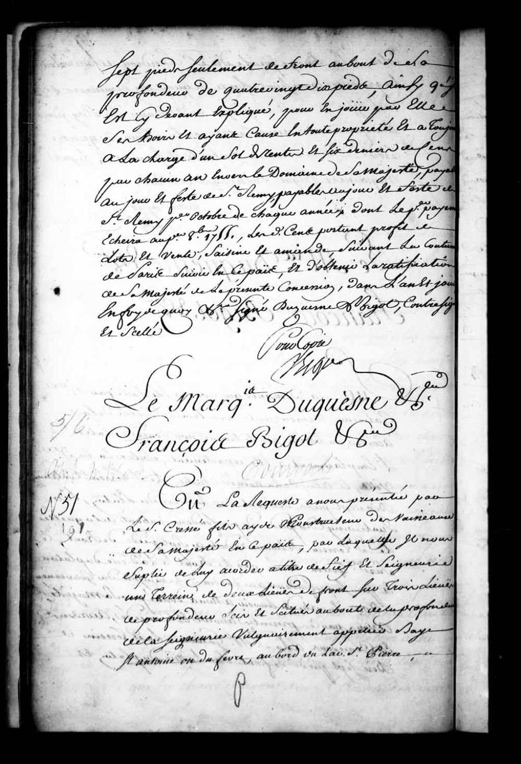 Acte de concession par Ange Duquesne, Marquis de Menneville, et François Bigot, gouverneur et intendant de la Nouvelle-France, au sieur Cressé fils, aide-constructeur des vaisseaux de Sa Majesté en ce pays, d'une étendue de terre de deux lieues de front sur trois lieues de profondeur à prendre au bout de la profondeur du fief de la baie Saint-Antoine ou du Febvre, à titre de fief et seigneurie avec haute, moyenne et basse justice