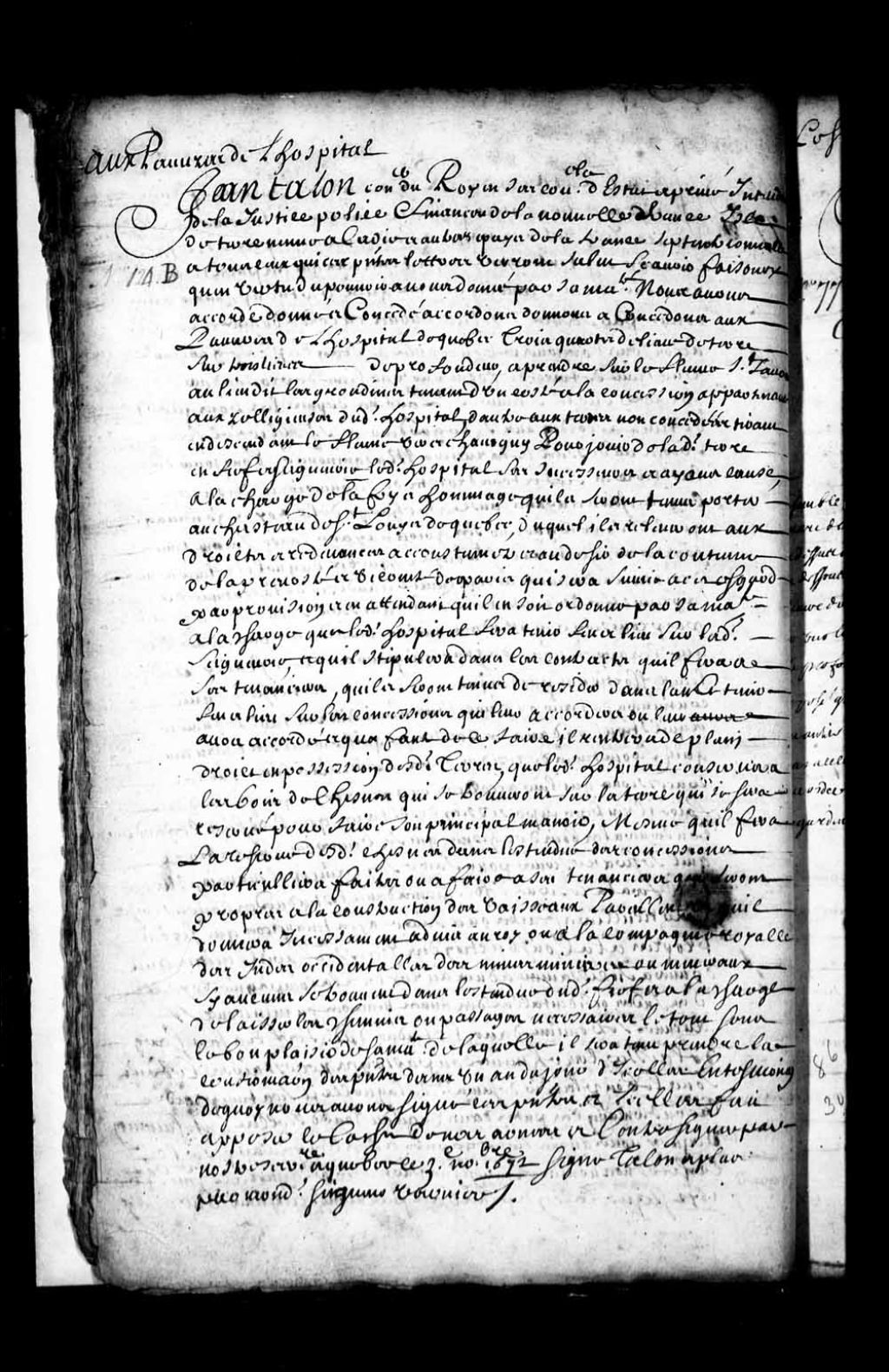 Acte de concession par Jean Talon, intendant de la Nouvelle-France, aux pauvres de l'Hôpital (Hôtel-Dieu) de Québec de trois quarts de lieue de terre sur trois lieues de profondeur, à prendre sur le fleuve Saint-Laurent au lieu dit des Grondines, tenant d'un côté à la concession appartenant aux Religieuses dudit hôpital et de l'autre aux terres non concédées, tirant en descendant le fleuve vers Chavigny, pour jouir de ladite terre en titre de fief et seigneurie