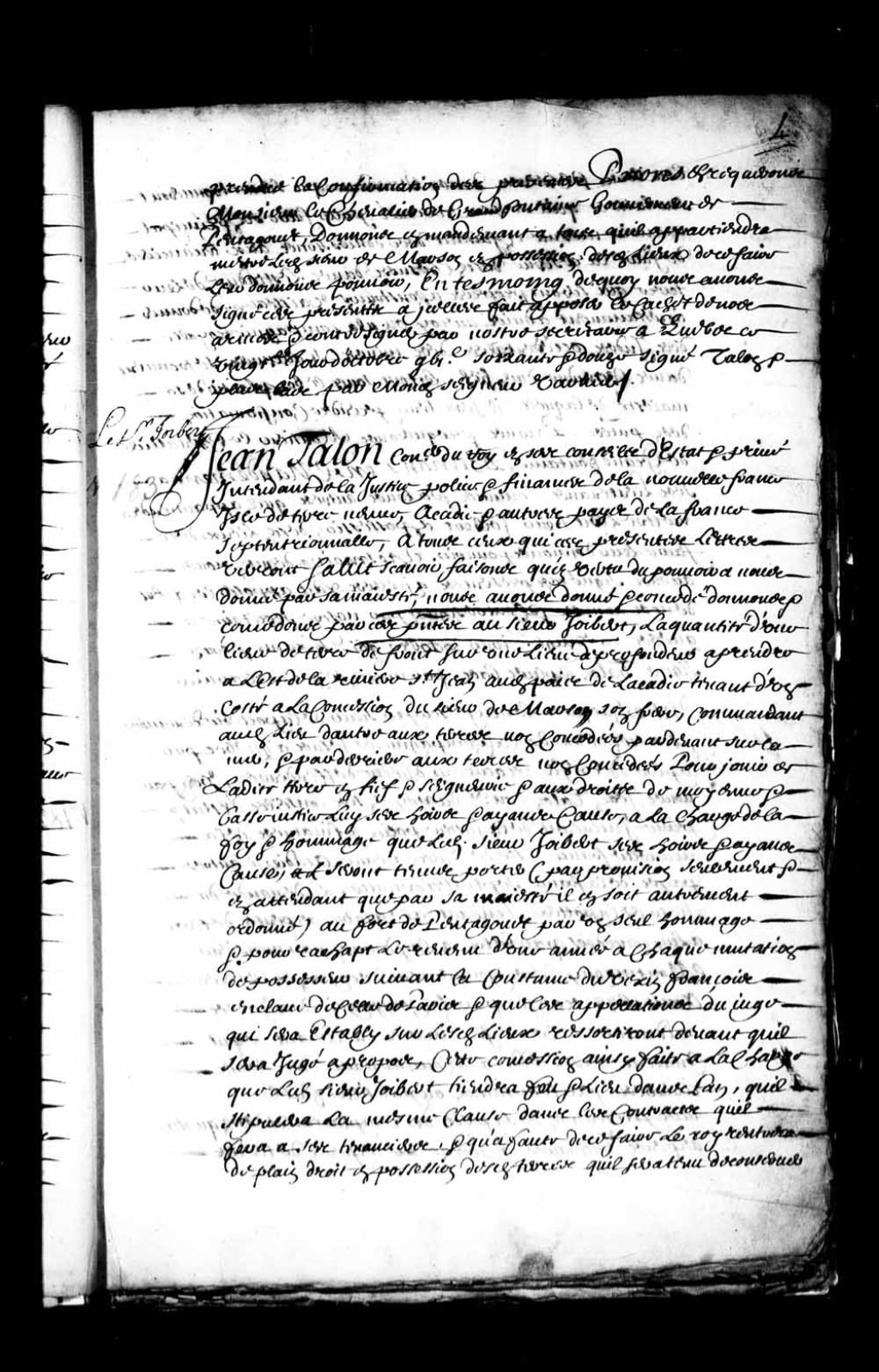 Acte de concession par Jean Talon, intendant de la Nouvelle-France, au sieur Joibert (Joybert) de la quantité d'une lieue de terre de front sur une lieue de profondeur, à prendre à l'est de la rivière Saint-Jean au pays de l'Acadie, tenant d'un côté à la concession du sieur de Marson, son frère, commandant audit lieu, de l'autre aux terres non concédées, par-devant à la mer et par-derrière aux terres non concédées, à titre de fief et seigneurie et avec les droits de moyenne et basse justice, 20 octobre 1672, Archives nationales à Québec, Fonds Intendants, (03Q,E1,S3,P5).