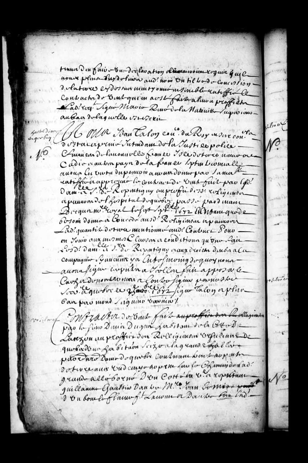 Ratification par l'intendant Jean Talon du contrat de vente passé le 7 septembre 1672 devant le notaire Romain Becquet par la veuve du sieur de Repentigny (Le Gardeur) aux Religieuses Hospitalières de Québec d'une pièce de terre donnant sur la rivière Saint-Charles et concession d'un titre de propriété à cet effet aux mêmes clauses et conditions portées au titre original