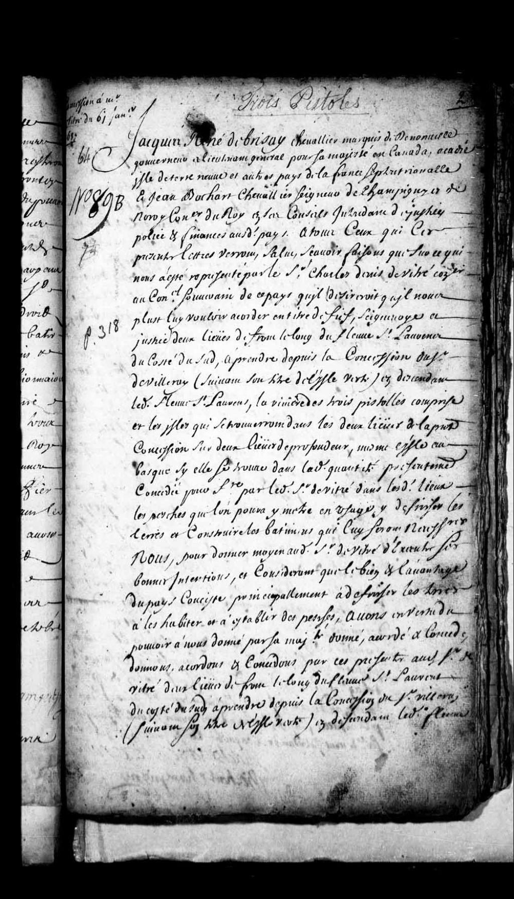 Acte de concession par Jacques-René de Brisay, Marquis de Denonville, et Jean Bochart Champigny, gouverneur et intendant de la Nouvelle-France, au sieur Charles Denys (Denis) de Vitré, conseiller au Conseil souverain de la Nouvelle-France, de deux lieues de front le long du fleuve Saint-Laurent, du côté du sud, à prendre depuis la concession du sieur de Villeray en descendant ledit fleuve, la rivière des Trois-Pistoles étant comprise, et les îles comprises dans les deux lieues de la présente concession, sur deux lieues de profondeur, comprenant même l'île aux Basques si elle se trouve dans ladite quantité présentement concédée, à titre de fief, seigneurie et justice