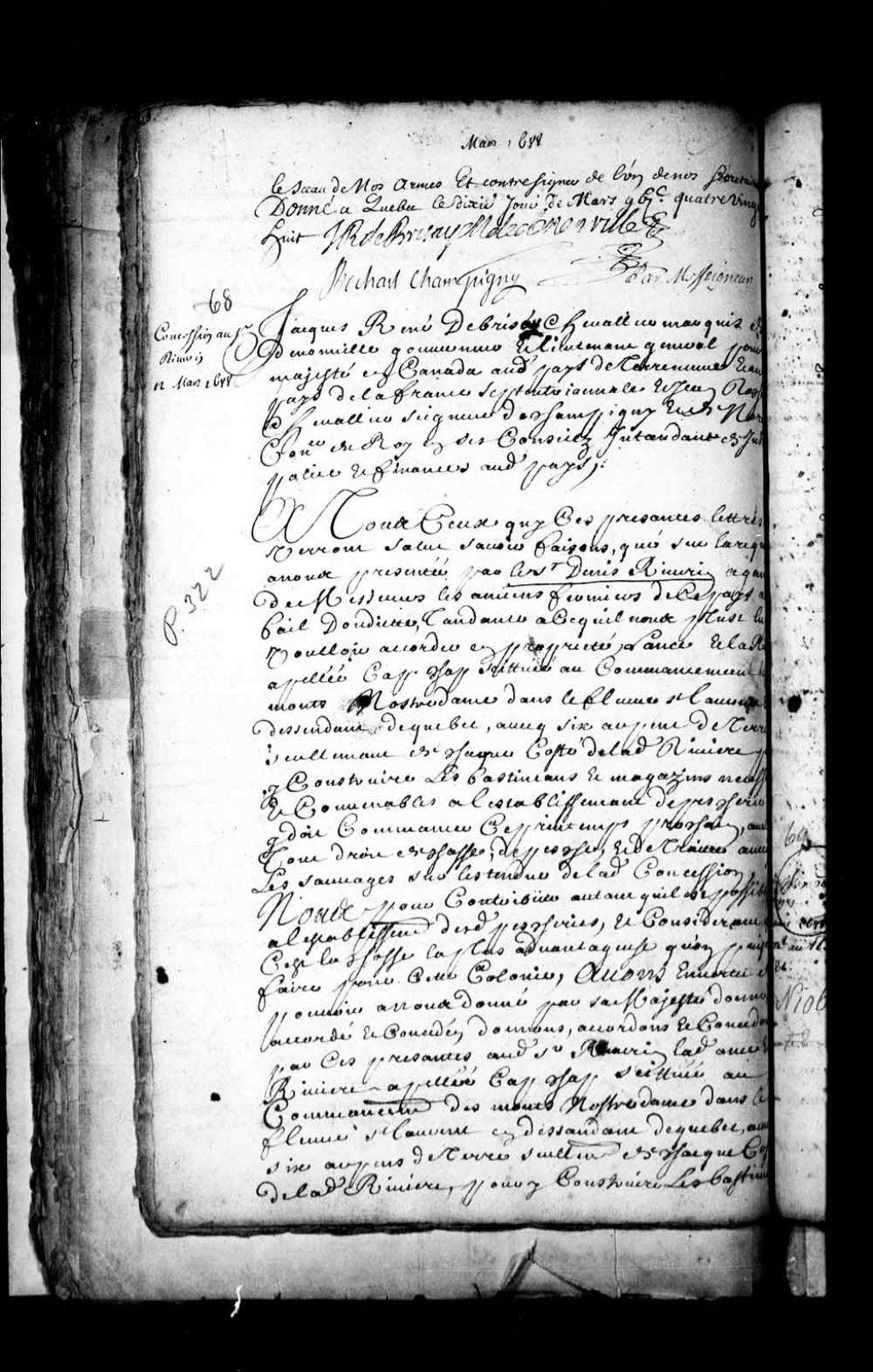 Acte de concession par Jacques-René de Brisay, Marquis de Denonville, et Jean Bochart Champigny, gouverneur et intendant de la Nouvelle-France, au sieur Denis Riverin, agent de Messieurs les anciens Fermiers de ce pays au bail d'Oudiette, de l'anse et rivière appelées Cap-Chat, situées au commencement des monts Notre-Dame dans le fleuve Saint-Laurent en descendant de Québec, avec six arpents de terre seulement de chaque côté de ladite rivière, afin d'y construire les bâtiments et magasins nécessaires et convenables à l'établissement de pêcheries, en toute propriété