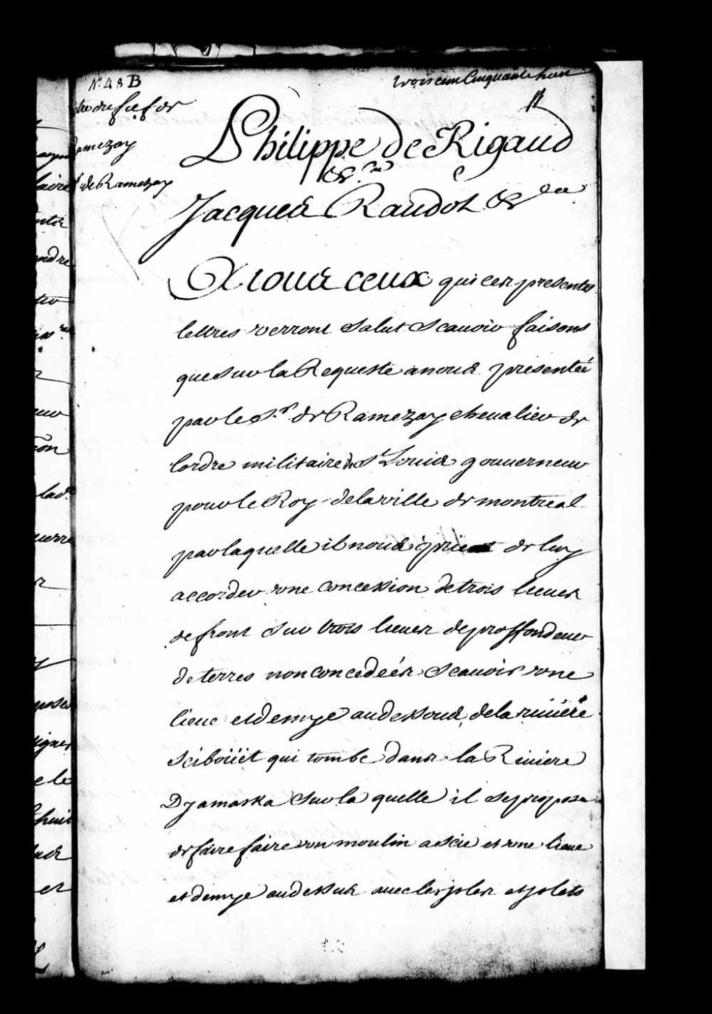 Acte de concession par Philippe de Rigaud, Marquis de Vaudreuil, gouverneur, et Jacques Raudot, intendant de la Nouvelle-France, au sieur de Ramezay, Chevalier de l'Ordre militaire de Saint-Louis, gouverneur pour le Roi de la ville de Montréal, de trois lieues de front sur trois lieues de profondeur de terres non concédées, à savoir une lieue et demie au-dessous de la rivière Sciebouet, qui tombe dans la rivière Yamaska, sur laquelle il se proposait de faire faire un moulin à scie, et une lieue et demie au-dessus, avec les îles et îlets qui pourraient se trouver dans ladite rivière vis-à-vis ladite concession, courant du nord-est au sud-ouest, le tout à titre de fief et seigneurie, laquelle concession portera le nom de Ramezay