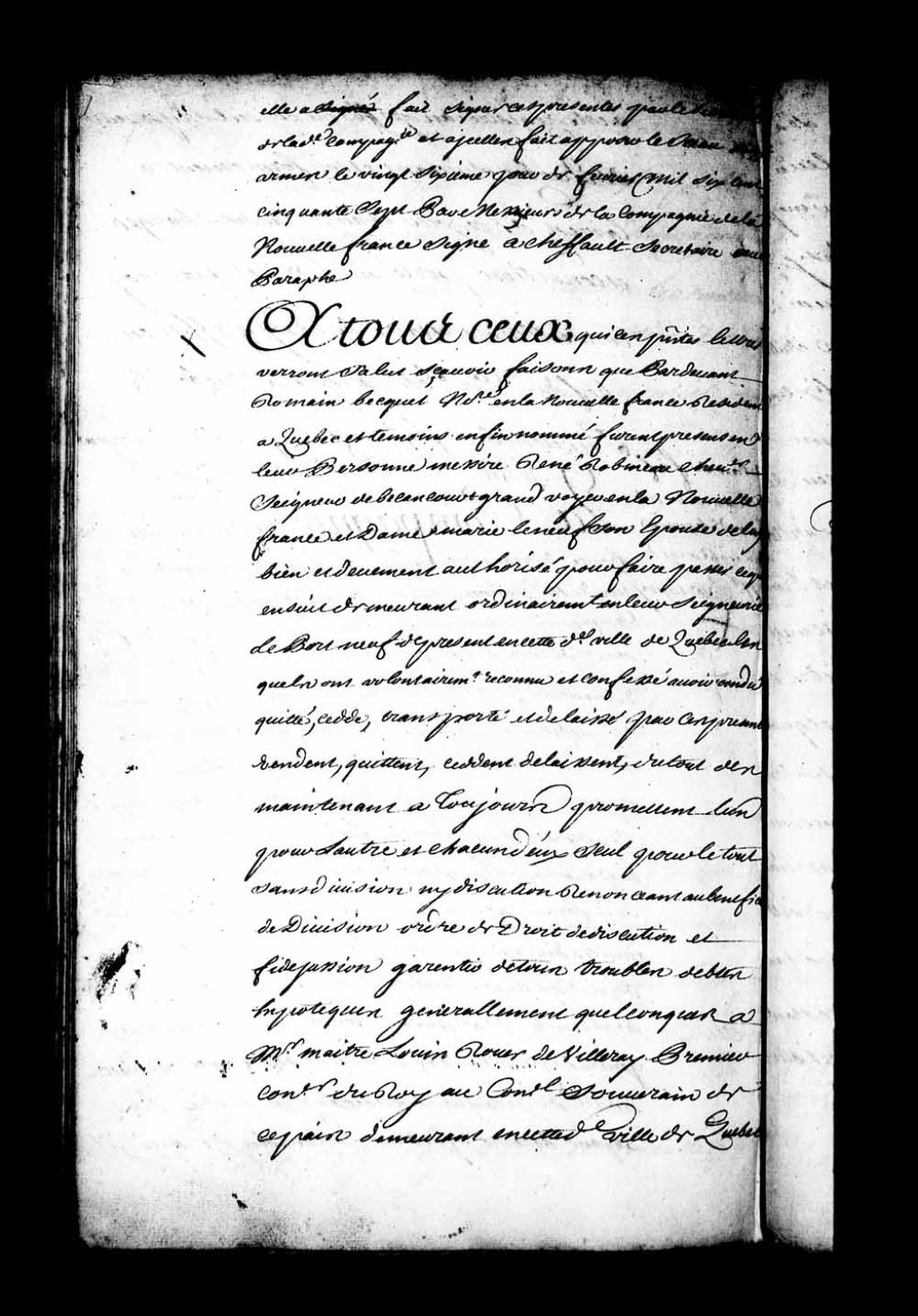 Contrat de vente par messire René Robineau, Chevalier, seigneur de Bécancour, grand voyer de la Nouvelle-France, et Marie Leneuf, son épouse, à Louis Rouer de Villeray du fief de Bécancour situé sur la Grande Allée, à Québec, constitué d'un arpent de front sur dix de profondeur, borné par-devant par la Grande Allée, par-derrière par le fleuve Saint-Laurent, d'un côté par les représentants de feue Marie-Marguerite Le Gardeur (LeGardeur), femme de feu Paul Godefroy, et de l'autre par un emplacement appartenant audit Rouer de Villeray (Notaire Romain Becquet)