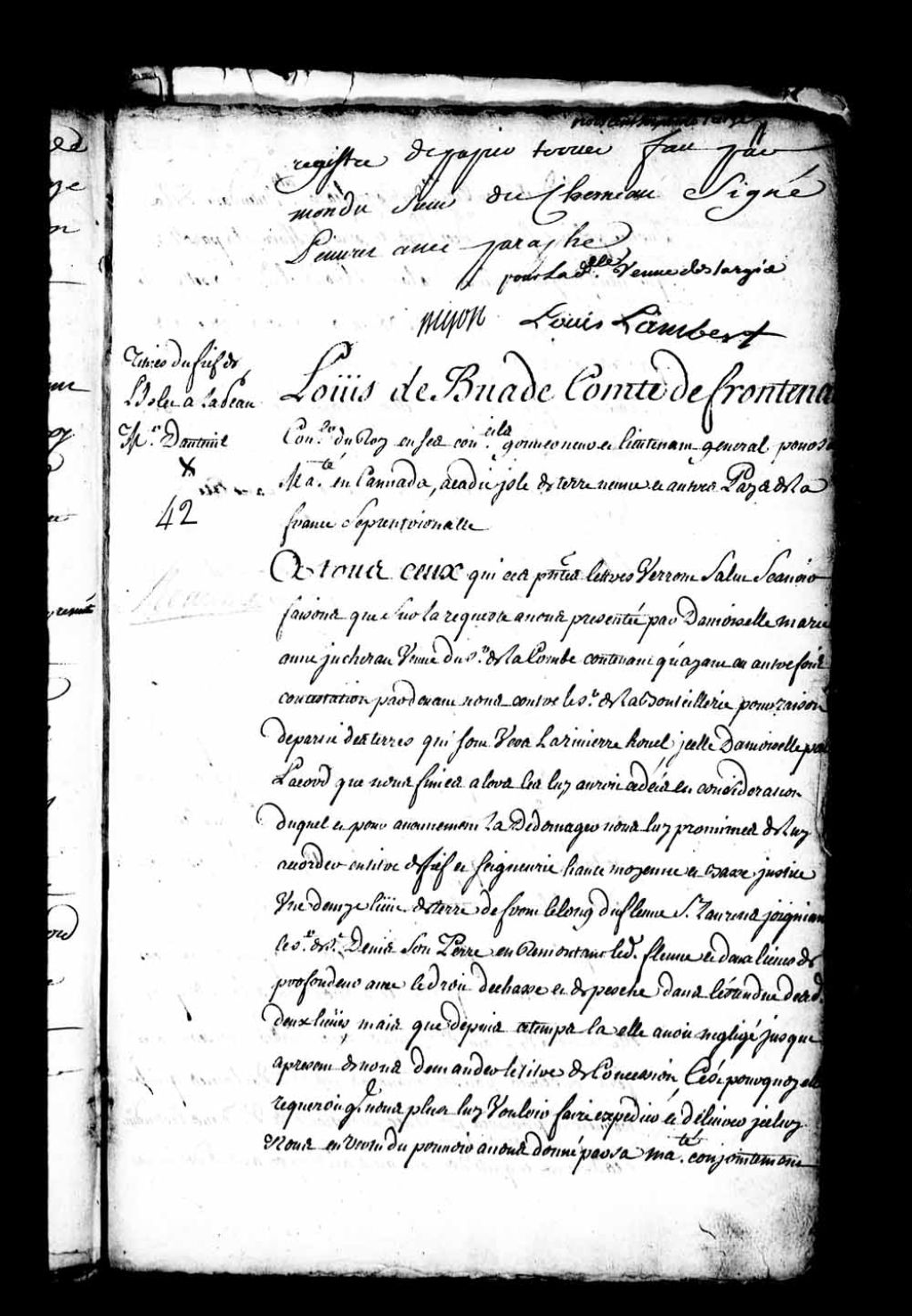 Acte de concession par Louis de Buade, Comte de Frontenac, gouverneur en Canada, à damoiselle Marie-Anne Juchereau, veuve du feu sieur de la Combe (Lacombe), d'une demi-lieue de terre de front le long du fleuve Saint-Laurent, à prendre depuis les terres du sieur Saint-Denis, son père, en remontant ledit fleuve, avec deux lieues de profondeur, en fief et seigneurie