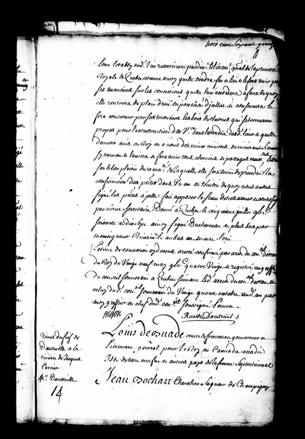 Acte de concession par Louis de Buade, Comte de Frontenac, gouverneur, et Jean Bochart Champigny, intendant de la Nouvelle-France, à François-Madeleine Ruette, écuyer, sieur d'Auteuil et de Monceaux, procureur général de Sa Majesté au Conseil souverain de la Nouvelle-France, d'un espace au lieu dit la rivière Jacques-Cartier d'une demi-lieue de front en descendant au nord-est du bout de ladite rivière sur cinq lieues de profondeur entre le fief dudit sieur d'Auteuil et celui du sieur Dupont, conseiller au Conseil souverain, qui a pour front la ligne de profondeur du sieur Toupin Dussault, au nord-est la ligne du sieur Dupont, au sud-ouest celle du fief dudit sieur d'Auteuil, et comprenant les rivières, ruisseaux et tout ce qui s'y trouvera compris, à titre de fief et seigneurie