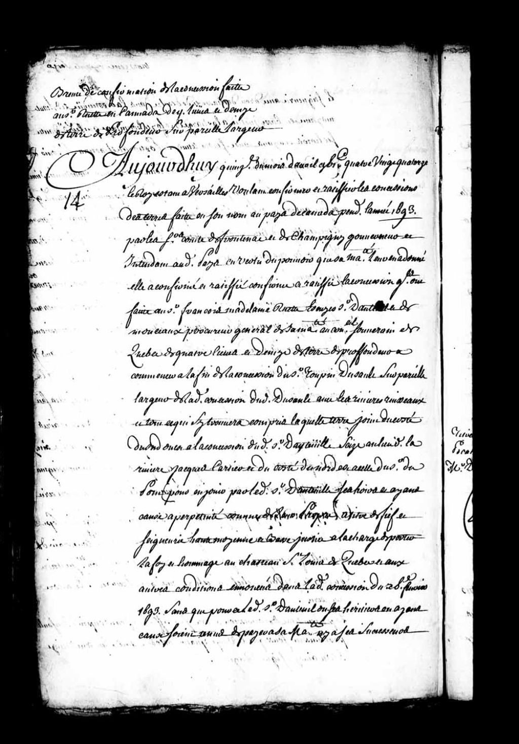 Brevet de confirmation par Sa Majesté de la concession faite au sieur François-Madeleine Ruette d'Auteuil, procureur général au Conseil souverain de Québec, d'une étendue de terre sur la rivière Jacques-Cartier, laquelle concession ayant été faite le 15 février 1693 par messires de Frontenac, gouverneur, et Bochart Champigny, intendant de la Nouvelle-France, 15 avril 1694, Archives nationales à Québec, Fonds Intendants, (03Q,E1,S4,SS1,D108,P2).