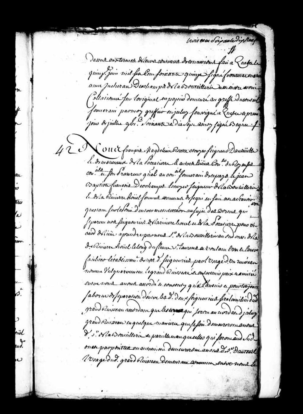Accord et partage entre François-Madeleine Ruette, écuyer, seigneur d'Auteuille (d'Auteuil), de Monceaux et de La Pocatière, conseiller et procureur général de Sa Majesté au Conseil souverain de Nouvelle-France, d'une part, et Jean-Baptiste François Deschamps, écuyer, sieur de la Bouteillerie et de la rivière Ouelle, quant aux bornes des seigneuries de La Pocatière et de la rivière Ouelle, 12 juin 1688, Archives nationales à Québec, Fonds Intendants, (03Q,E1,S4,SS1,D109,P3).