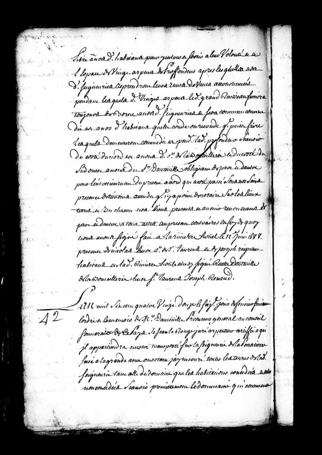 Procès-verbal d'arpentage du fief de La Pocatière, sis à la grande Anse, quant aux mesures des terres concédées et non concédées, lequel arpentage ayant été fait à la réquisition du sieur Dauteuille (Dauteuil, d'Auteuil) (Arpenteur Jean Lerouge), 16 février 1692, Archives nationales à Québec, Fonds Intendants, (03Q,E1,S4,SS1,D109,P4).
