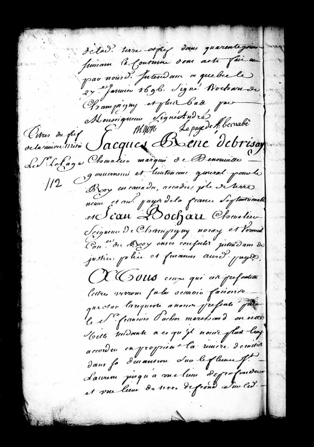 Acte de concession par Jacques-René de Brisay, Marquis de Denonville, gouverneur, et Jean Bochart Champigny, intendant de la Nouvelle-France, au sieur François Pachot, marchand à Québec, de la rivière de Mitis dans sa devanture sur le fleuve Saint-Laurent, jusqu'à une lieue de profondeur, et une lieue de terre de front sur ledit fleuve, moitié au-dessus et moitié au-dessous de ladite rivière, pour y faire un établissement de pêche des morues, baleines et loups-marins, en titre de fief et seigneurie