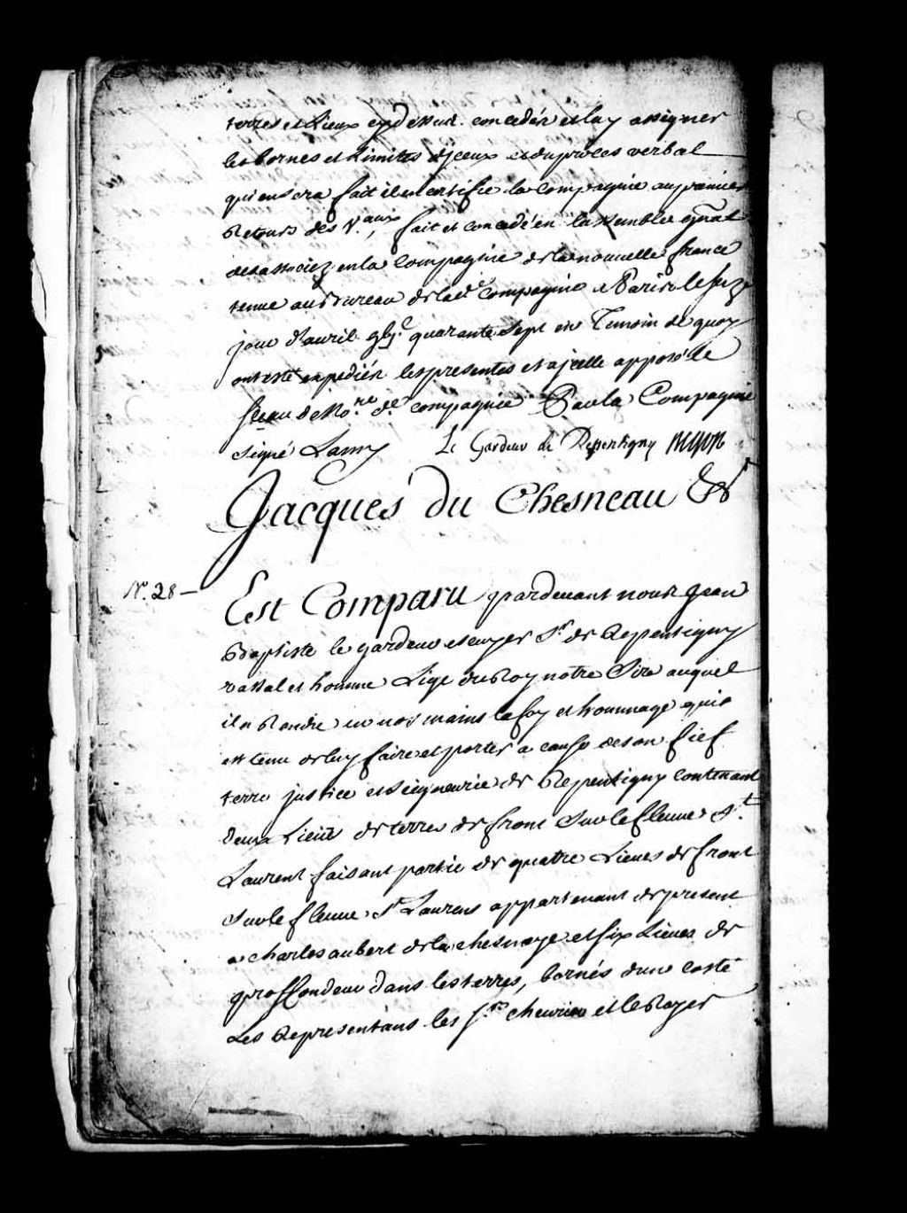Acte de foi et hommage fait devant Jacques Duchesneau, intendant de la Nouvelle-France, par Jean-Baptiste Le Gardeur (LeGardeur), écuyer, sieur de Repentigny, pour son fief, terre et seigneurie de Repentigny qu'il tient de la Compagnie de la Nouvelle-France par concession du 16 avril 1647