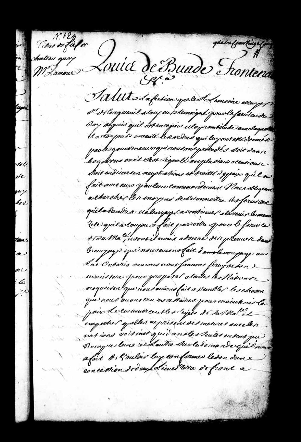 Acte de concession par Louis de Buade, Comte de Frontenac, gouverneur de la Nouvelle-France, à monsieur Lemoyne (Lemoine), écuyer, sieur de Longueuil, de deux lieues de terre de front à commencer dix arpents au-dessous de la rivière du Loup en montant dans le lac Saint-Louis, du côté du sud, et de trois lieues de profondeur, laquelle comprenant en outre l'île Saint-Bernard à l'embouchure de ladite rivière, en titre de fief, seigneurie et justice