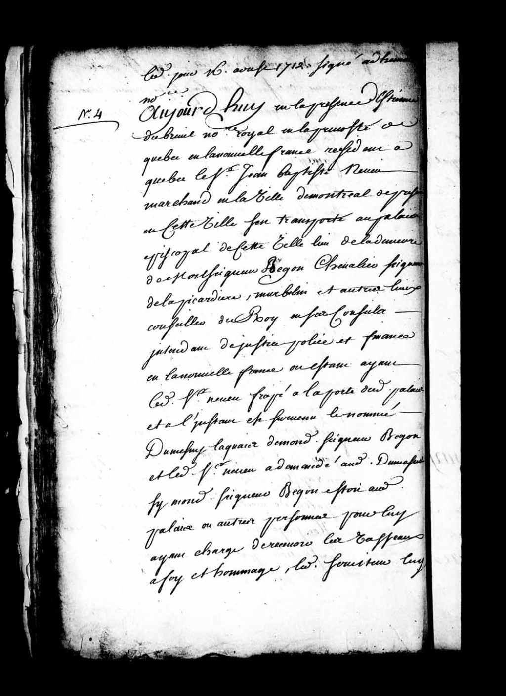 Aveu et dénombrement fait par Maître Jean-Baptiste Neveu, marchand de Montréal, pour le fief et seigneurie de Dautré (Dautray, d'Autray) relevant du château Saint-Louis de Québec, 1er novembre 1716, Archives nationales à Québec, Fonds Intendants, (03Q,E1,S4,SS1,D118,P4).