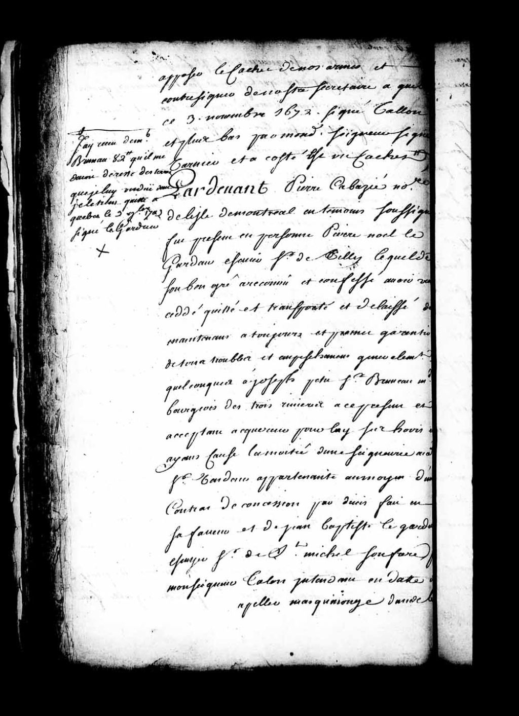 Contrat de vente par Pierre-Noël Le Gardeur (LeGardeur), sieur de Tilly, à Joseph Petit, sieur Brunneau (Bruneau), de la moitié d'un fief à lui accordé conjointement avec son frère Jean-Baptiste Le Gardeur, sieur de Saint-Michel, par monsieur Talon, intendant, le 3 novembre 1672, lequel fief étant situé sur la rivière Maskinongé (Notaire Pierre Cabazié)