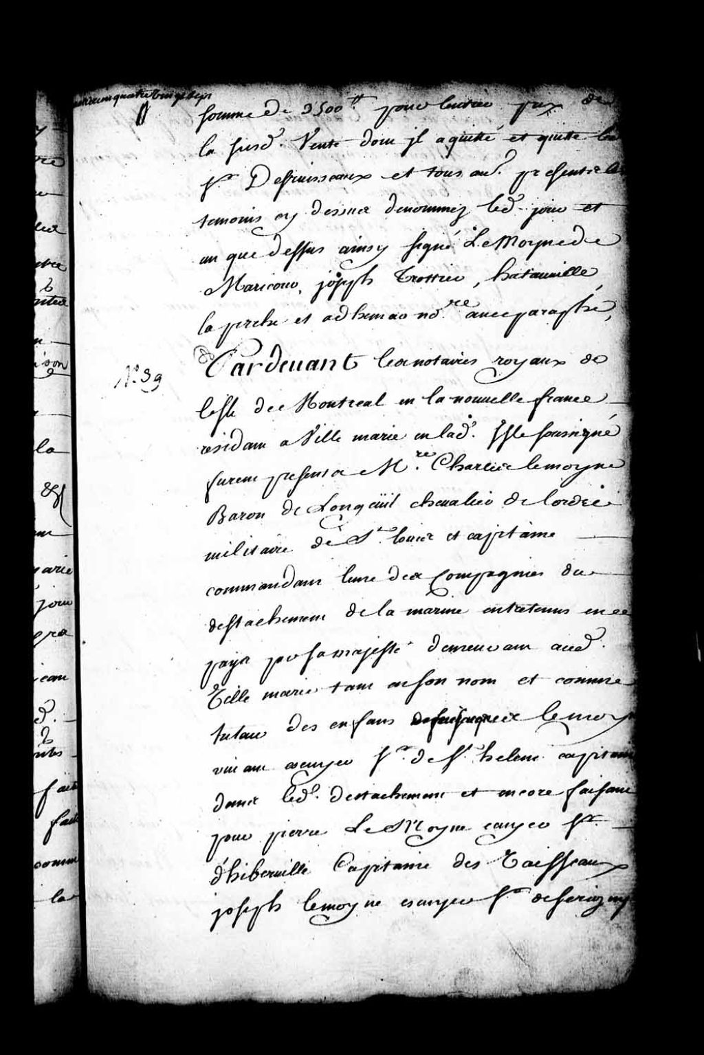 Ratification par Charles Lemoyne (Lemoine), Baron de Longueuil, Chevalier de l'Ordre militaire de Saint-Louis et capitaine commandant l'une des compagnies du détachement de la Marine entretenues en ce pays par Sa Majesté, demeurant à Ville-Marie, tant en son nom que comme tuteurs des enfants mineurs de feu Jacques Lemoyne, de son vivant écuyer, sieur de Sainte-Hélène, capitaine dans ledit détachement de la Marine, et encore faisant pour Pierre Lemoyne, écuyer, sieur d'Hiberville (Iberville), capitaine de vaisseaux, pour Joseph Lemoyne, écuyer, sieur de Serigny, enseigne des vaisseaux, pour Jean-Baptiste Lemoyne, écuyer, sieur de Bienville, enseigne des vaisseaux et commandant au Mississippi, ses frères, et par Jean Bouillet, écuyer, sieur la Chassaigne (LaChassaigne), et dame Marie-Anne Lemoyne, son épouse, et par Jacques Leber (Lebert), écuyer, sieur de Senneville, au nom et comme tuteur d'Antoine Lemoyne, écuyer, sieur de Châteauguay et commandant au Mississippi, du contrat de vente passé le 27 avril 1703 devant le notaire Antoine Adhémar dit Saint-Martin (Notaires Michel Lepailleur de LaFerté et Antoine Adhémar dit Saint-Martin)