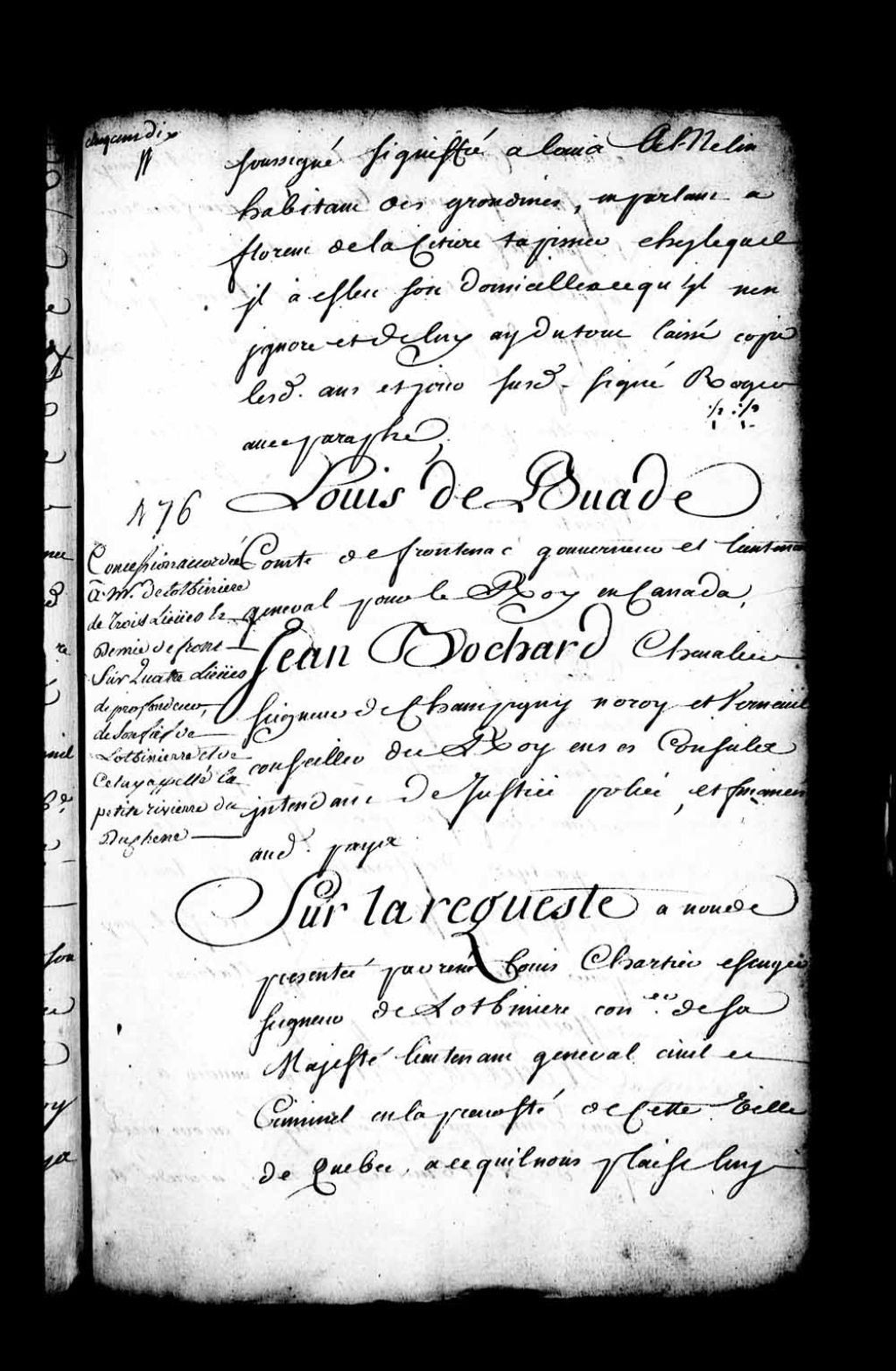 Acte de concession par Louis de Buade, Comte de Frontenac, gouverneur, et Jean Bochart Champigny, intendant de la Nouvelle-France, à René-Louis Chartier, écuyer, seigneur de Lotbinière, conseiller de Sa Majesté, lieutenant général civil et criminel en la Prévôté de Québec, de trois lieues et demie de terres de front, avec quatre lieues de profondeur, à prendre au bout où se termine la profondeur du fief de Lotbinière et de l'autre appelé la Petite-Rivière-du-Chêne (Petite-Rivière-Duchesne), lequel lui appartenant au moyen de l'acquisition qu'il en a faite du sieur de Louvière (Louvières), laquelle concession comprenant en outre tous les bois, prés, îles, rivières et lacs qui s'y trouvent, laquelle concession sera partagée entre tous les enfants dudit seigneur de Lotbinière par égales portions qui seront autant de fiefs distingués indépendants les uns des autres et sans qu'il n'y ait aucun droit d'aînesse entre eux s'il arrive que ledit sieur de Lotbinière décède sans avoir autrement disposé de la présente concession, sans quoi elle n'aurait été accordée, à titre de fief et seigneurie avec haute, moyenne et basse justice