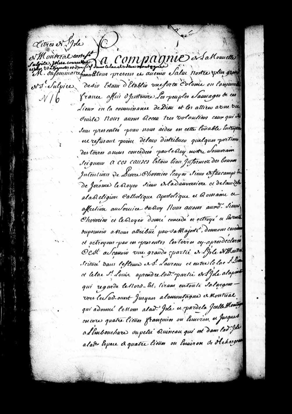 Acte de concession par la Compagnie de la Nouvelle-France à Pierre Chevrier, écuyer, sieur de Fancamp, et Jérôme Le Royer, sieur de la Dauversière, d'une grande partie de l'île de Montréal située dans le fleuve Saint-Laurent entre le lac Saint-Pierre et le lac Saint-Louis, à prendre à partir de la pointe qui regarde le nord-est, tirant en toute sa largeur vers le sud-ouest jusqu'à la montagne de Montréal qui a donné le nom à ladite île, et par-delà de la montagne encore quatre lieues françaises ou environ et jusqu'à l'embouchure du petit ruisseau qui est dans ladite île à ladite espace de quatre lieues ou environ, lequel ruisseau se déchargeant dans le canal qui sépare ladite île de Montréal d'une autre île appelée l'île de Jésus, le reste de ladite île à prendre depuis l'embouchure duquel ruisseau sera tirée une ligne droite jusqu'à l'autre bord de ladite île qui est sur ledit lac Saint-Louis, plus une étendue de terre de deux lieues de large le long du fleuve Saint-Laurent sur six lieues de profondeur dans lesdites terres à prendre du côté du nord sur la même côte où se décharge la rivière de l'Assomption dans ledit fleuve de Saint-Laurent et à commencer à une borne qui sera mise sur cette même côte à la distance de deux lieues de l'embouchure de ladite rivière de l'Assomption, le reste desdites deux lieues de face à prendre en descendant sur ledit fleuve Saint-Laurent tout ce qui est de la rivière des Prairies jusqu'à la rivière de l'Assomption et depuis ladite rivière de l'Assomption jusqu'à la borne ci-dessus réservée à ladite Compagnie se proposant d'y faire quelques forts et habitations, en tous droits de fief et seigneurie