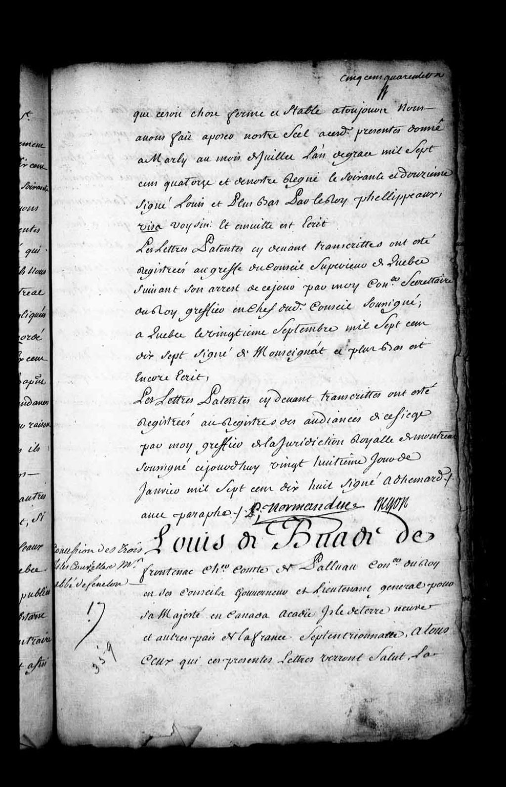 Acte de concession par Louis de Buade, Comte de Frontenac, gouverneur de la Nouvelle-France, au sieur abbé de Fénelon de trois îles dans le lac Saint-Louis le long de l'île de Montréal entre Lachine et le Cap-Saint-Gilles, appelées les îles Courcelles, pour faciliter l'établissement commencé pour élever de petits Sauvages (amérindiens), suivant les moeurs et coutume françaises, en titre de fief et seigneurie