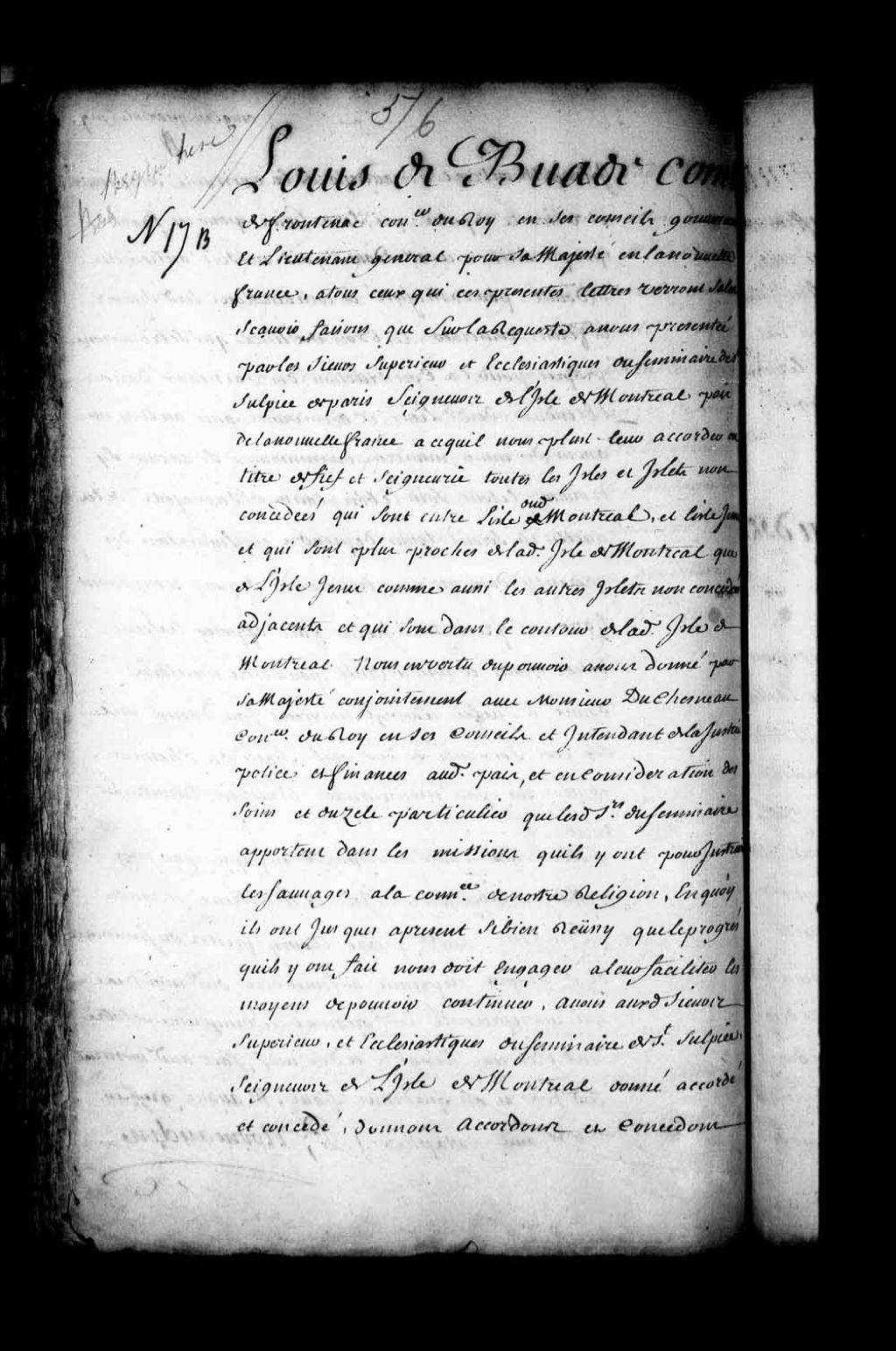 Acte de concession par Louis de Buade, Comte de Frontenac, gouverneur de la Nouvelle-France, aux Supérieur et Ecclésiastiques du Séminaire de Saint-Sulpice de Paris de toutes les îles et de tous les îlets non concédés entre l'île de Montréal et l'île Jésus, comme aussi les autres îles non concédées adjacentes étant dans le contour de ladite île de Montréal, en titre de fief, seigneurie et justice, 5 septembre 1679, Archives nationales à Québec, Fonds Intendants, (03Q,E1,S4,SS1,D124,P13).
