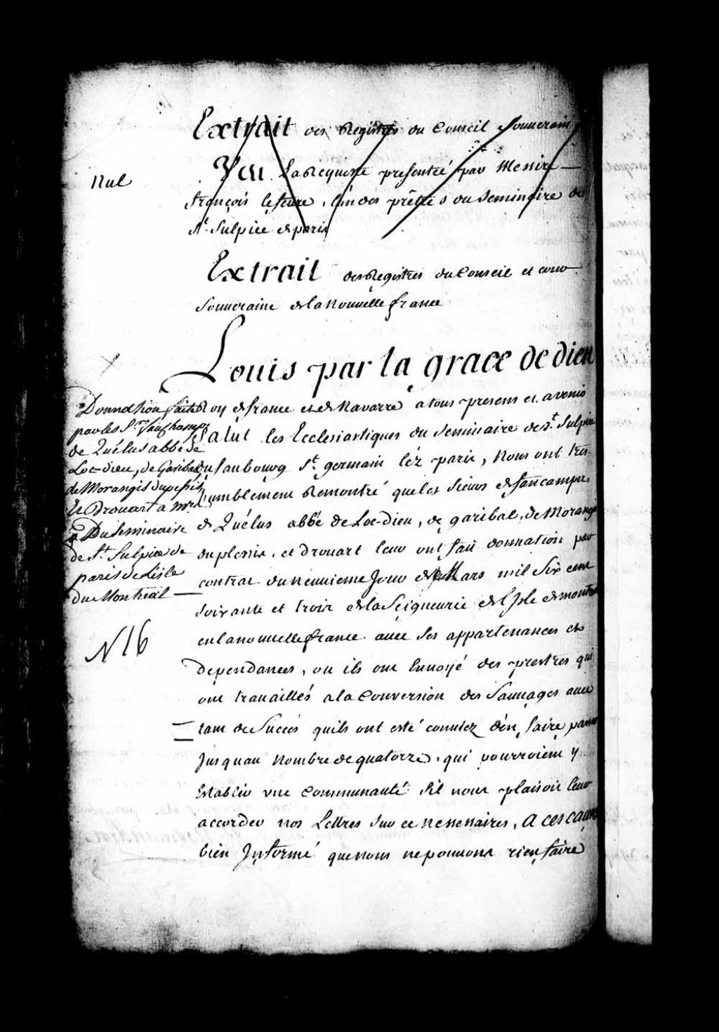 Ratification et amortissement par Sa Majesté de la donation de l'île de Montréal pour la conversion des Sauvages (Amérindiens) en faveur de messires les Ecclésiastiques du Séminaire de Saint-Sulpice du faubourg Saint-Germain près de Paris, 1er mai 1677 - 31 mai 1677, Archives nationales à Québec, Fonds Intendants, (03Q,E1,S4,SS1,D124,P6).