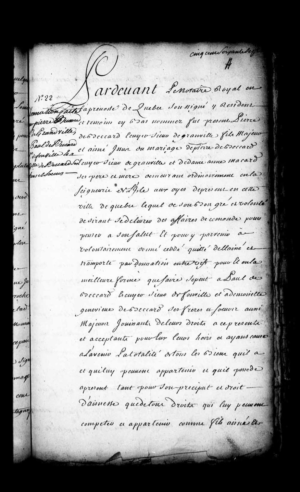 Acte de donation par Pierre Bécard, écuyer, sieur de Grandville (Granville), fils aîné issu du mariage de Pierre Bécard, écuyer, sieur de Grandville, et dame Anne Macard, ses père et mère, à Paul Bécard de Fonville et Geneviève Bécard de Grandville, ses frère et sœur, de tous ses biens, y inclus le fief de l'île aux Oies (Notaire Florent de La Cetière), 3 septembre 1723, Archives nationales à Québec, Fonds Intendants, (03Q,E1,S4,SS1,D128,P5).