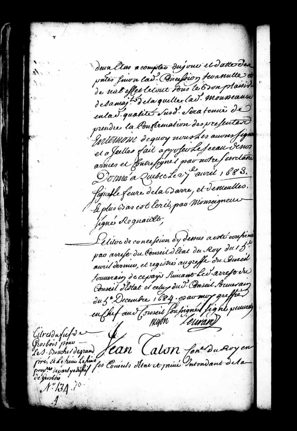Ratification par arrêt du Conseil d'État du Roi de la concession de l'île Madame, située au sud de l'île d'Orléans à Louise Mousseaux (Mousseau), femme de Pierre Pellerin, en qualité de tutrice de Marie-Louise Becquet et de Catherine-Angélique Becquet, filles de feu Romain Becquet, laquelle concession ayant été faite le 27 avril 1683 par messires Lefebvre de La Barre et de Meulles, gouverneur et intendant de la Nouvelle-France
