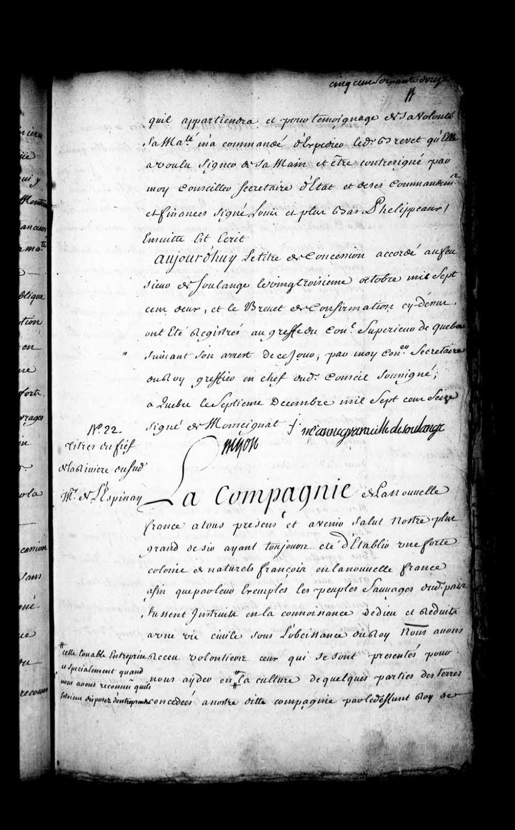 Acte de concession par la Compagnie de la Nouvelle-France au sieur de Montmagny, Chevalier de l'Ordre de Saint-Jean de Jérusalem, de la rivière appelée du Sud à l'endroit où elle se décharge dans le fleuve Saint-Laurent avec une lieue de terre le long dudit fleuve en montant de ladite rivière vers Québec, et une demi-lieue le long dudit fleuve en descendant vers le golfe, le tout sur la profondeur de quatre lieues en avant dans les terres en côtoyant ladite rivière, avec en outre les deux îles situées dans ledit fleuve près dudit lieu en descendant sur ledit fleuve, l'une appelée l'île aux Oies et l'autre appelée l'île aux Grues avec les battures entre eux, le tout contenant quatre lieues ou environ de longueur sur ledit fleuve, pour en jouir par ledit sieur de Montmagny en toute propriété, justice et seigneurie