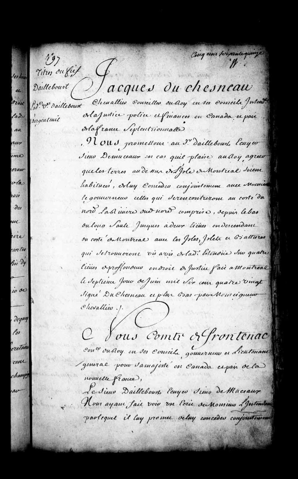 Promesse de Louis de Buade, Comte de Frontenac, gouverneur de la Nouvelle-France, au sieur d'Ailleboust, écuyer, sieur de Musseaux, de lui concéder conjointement avec monsieur l'intendant deux lieues de terre du côté du nord, à commencer au bas du Long-Sault, la rivière du Nord y comprise, en descendant vers Montréal, sur quatre lieues de profondeur, comprenant les îles, îlets et battures dans l'étendue desdites deux lieues, dont l'île appelée Carion fait partie, le tout en titre de fief, seigneurie et justice