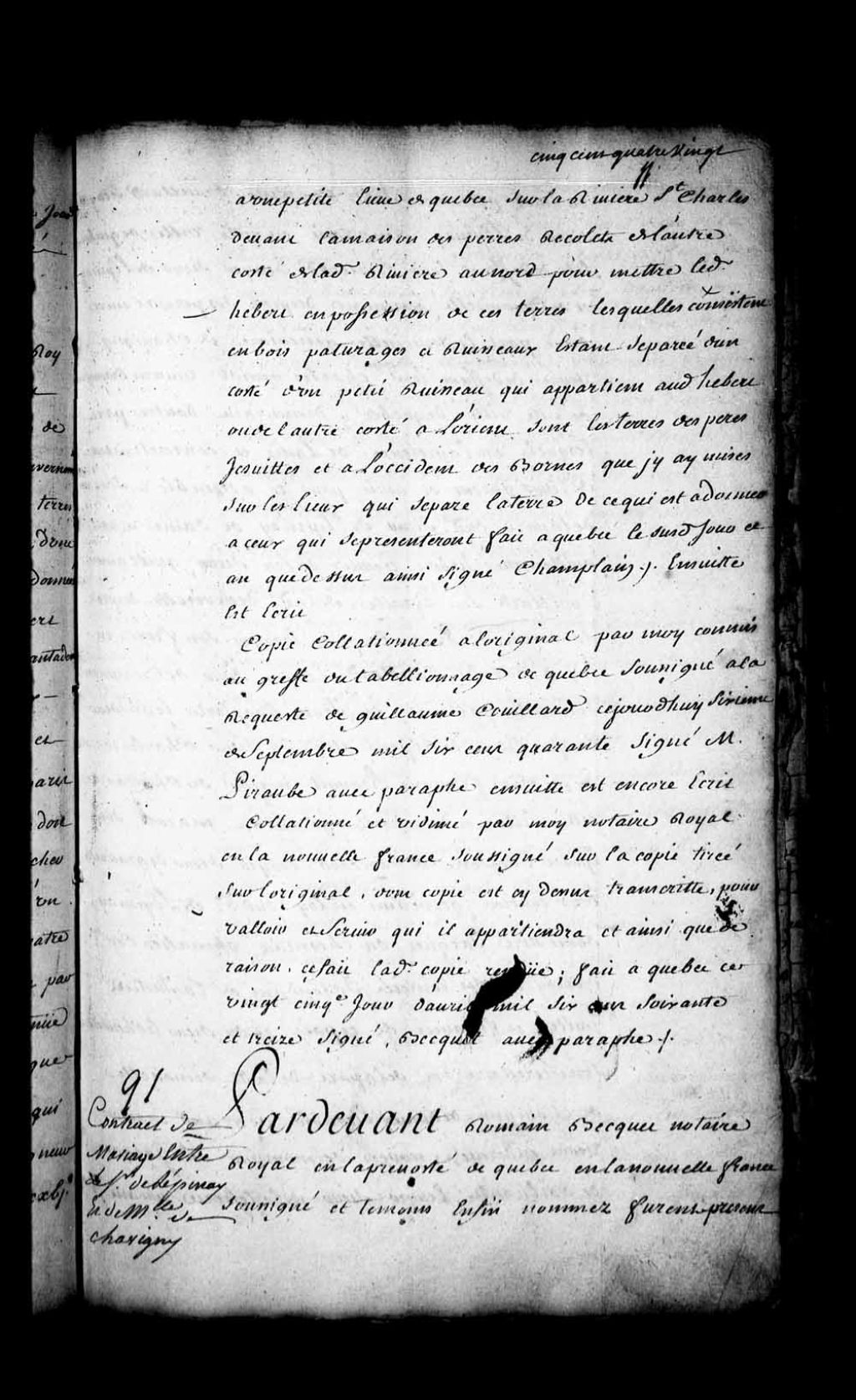 Contrat de mariage entre Jean-Baptiste Couillard, écuyer, sieur de Lespinay (L'Espinay), de Québec, fils de défunt Louis Couillard, écuyer, sieur de Lespinay, et de damoiselle Geneviève Desprez (Després), d'une part, et damoiselle Geneviève de Chavigny, veuve du sieur Charles Amyot (Amiot), de son vivant bourgeois de Québec, d'autre part, par lequel contrat Guillemette Hébert, veuve de Guillaume Couillard, aïeule dudit Jean-Baptiste Couillard, fait donation aux époux du fief Saint-Joseph (Notaire Romain Becquet), 16 octobre 1680, Archives nationales à Québec, Fonds Intendants, (03Q,E1,S4,SS1,D132,P3).