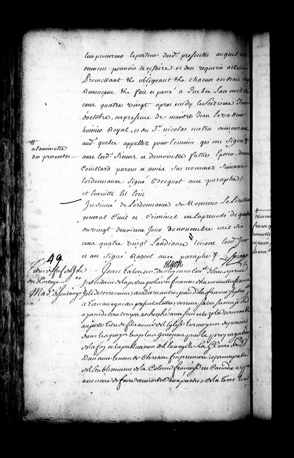 Acte de concession par Jean Talon, intendant de la Nouvelle-France, au sieur de Grandville (Granville), enseigne de la compagnie de Berthier, de l'îlet nommé du Portage sur le fleuve Saint-Laurent, avec une demi-lieue de terre au-dessous et une autre au-delà dudit îlet, à titre de fief et seigneurie, 29 octobre 1672, Archives nationales à Québec, Fonds Intendants, (03Q,E1,S4,SS1,D133,P1).