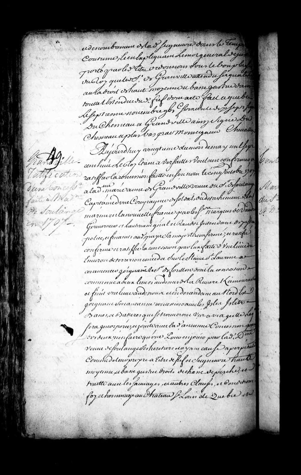 Brevet de confirmation par Sa Majesté de la concession accordée à dame Marie-Anne de Grandville (Granville), veuve du sieur de Soulanges, d'une étendue de terre sur le fleuve Saint-Laurent attente aux terres du sieur de Forillon, près de la rivière Kamouraska, laquelle concession ayant été faite le 5 octobre 1707 par messires de Vaudreuil et Raudot, gouverneur et intendant de la Nouvelle-France