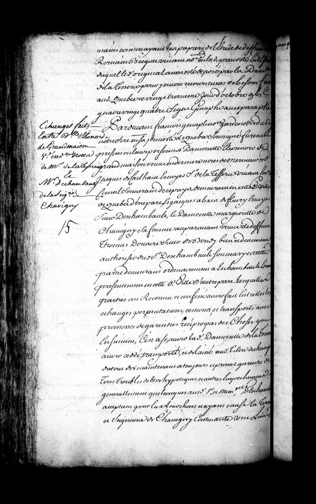Contrat d'échange entre Éléonore de Grandmaison, veuve en dernières noces de Maître Jacques Descailhault, écuyer, sieur de la Tesserie, conseiller au Conseil souverain de Nouvelle-France, d'une part, et Jacques-Alexis de Fleury, écuyer, sieur de Deschambault, et dame Marguerite de Chavigny, fille de ladite Éléonore de Grandmaison, sa femme, auparavant veuve du défunt Thomas Douaire, sieur de Bondy, d'autre part, de la terre et seigneurie de Chavigny, en retour d'une terre sise en l'île et comté de Saint-Laurent (île d'Orléans), respectivement (Notaire François Genaple de Bellefonds)