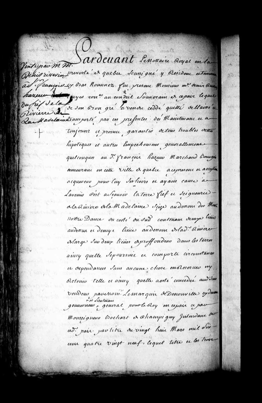 Contrat de vente par Maître Denis Riverin, conseiller au Conseil souverain de la Nouvelle-France, au sieur François Hazeur, marchand bourgeois de Québec, de la terre, fief et seigneurie de la Rivière-de-la-Madeleine sise au-dessous des Monts Notre-Dame du côté sud (Notaire Louis Chambalon), 15 mars 1700, Archives nationales à Québec, Fonds Intendants, (03Q,E1,S4,SS1,D136,P2).