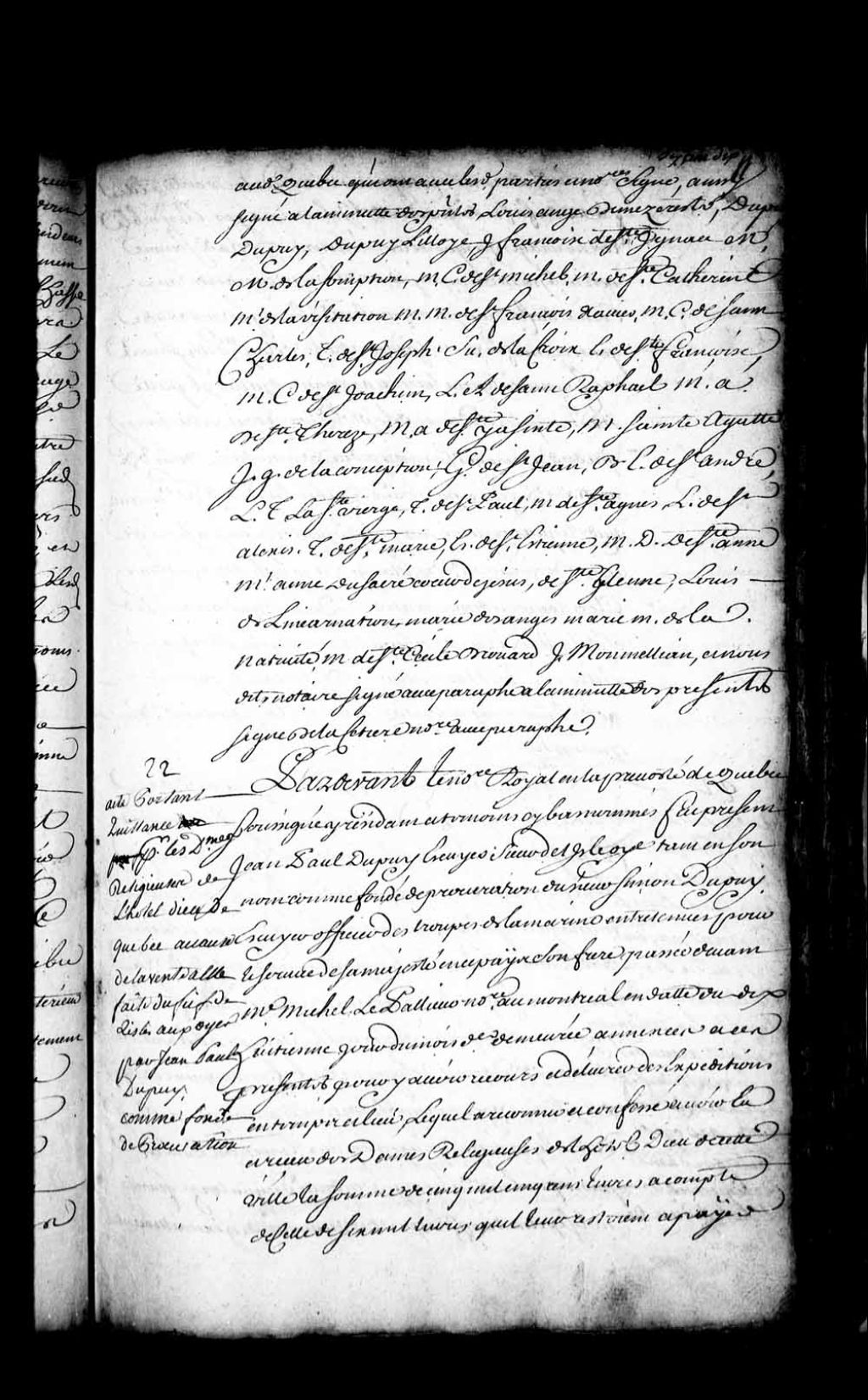 Quittance de Jean-Paul Dupuy (Dupuis), écuyer, sieur de l'île aux Oies, tant en son nom que comme fondé de procuration du sieur Simon Dupuy, écuyer, officier des troupes de la Marine en Nouvelle-France, son frère, en faveur des Dames Religieuses de l'Hôtel-Dieu de Québec, quant à la somme de cinq mille cinq cents livres due pour l'achat par lesdites religieuses du fief et seigneurie de l'île aux Oies (Notaire Florent de La Cetière), 14 mai 1714, Archives nationales à Québec, Fonds Intendants, (03Q,E1,S4,SS1,D139,P2).