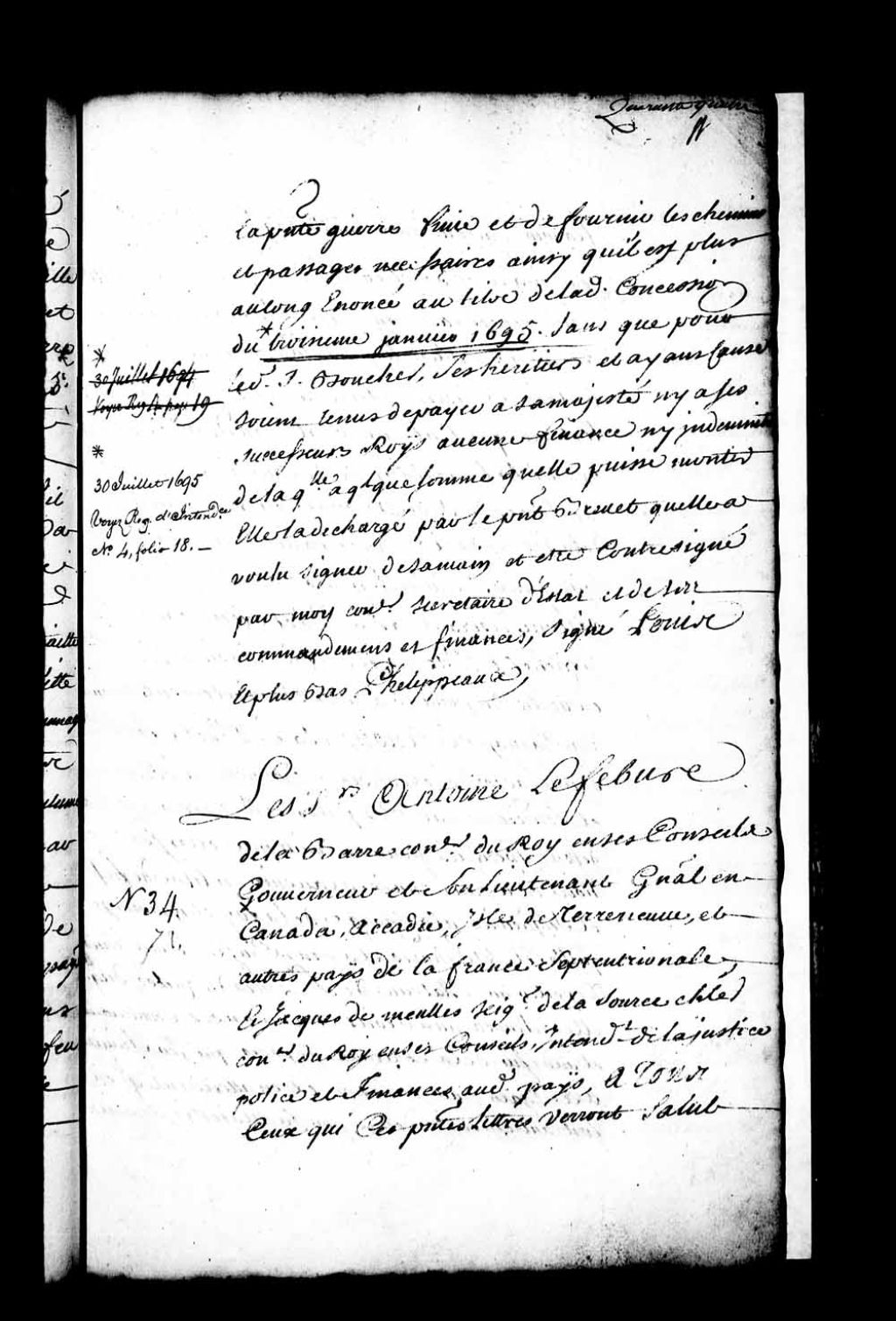 Acte de concession par le sieur Antoine Lefebvre de La Barre, gouverneur, et par Jacques de Meulles, intendant de la Nouvelle-France, à Marie Boucher, veuve du feu sieur Étienne de Lafond, demeurant au Cap-de-la-Madeleine, des terres qui sont d'un côté au-dessus de celles de Michel Poulain (Poulin) et de l'autre au-dessous des terres du sieur de Varennes dites Sault de la Vérendrye, sur pareille profondeur que les terres desdits Poulain et Varennes, en titre de fief et seigneurie