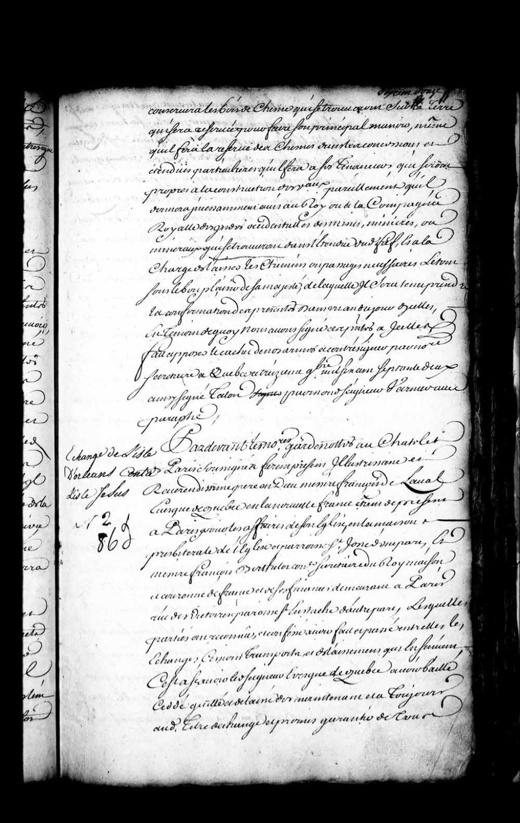 Contrat d'échange entre monseigneur de Laval, d'une part, et messire François Berthelot, conseiller du Roi, demeurant rue des Victoires de la paroisse Saint-Eustache de Paris, d'autre part, de l'île d'Orléans et ses redevances, rentes seigneuriales, fermes, bâtiments, deux moulins à vent, terres labourables, prés, bois et autres dépendances, en retour de l'île Jésus, vis-à-vis celle de Montréal, avec toutes ses dépendances, respectivement
