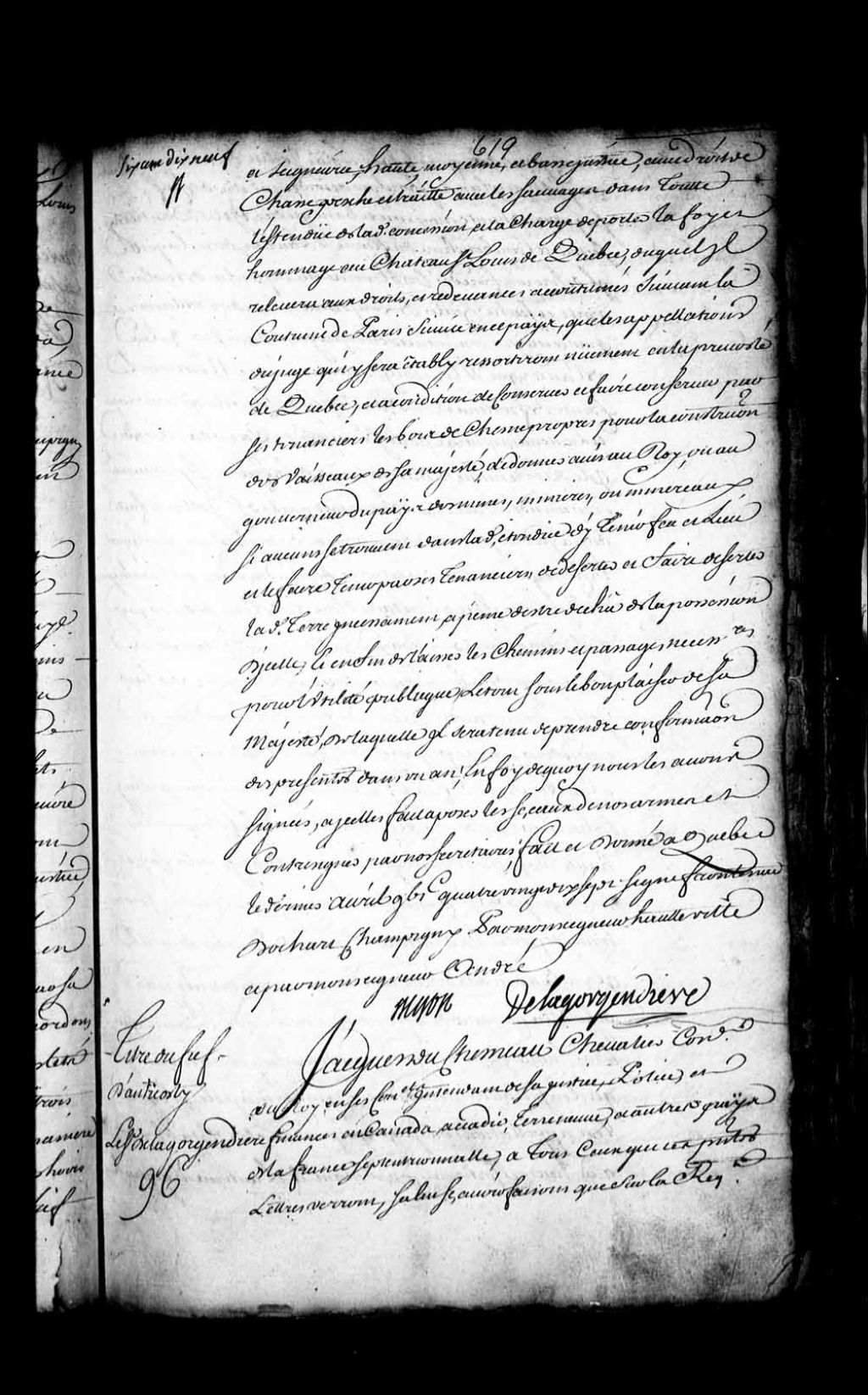 Acte de concession par la Compagnie de la Nouvelle-France à Louis Jolliet, demeurant à Québec, de l'île d'Anticosti, située à l'embouchure du fleuve Saint-Laurent, en titre de fief et seigneurie, 1er mars 1680 - 31 mars 1680, Archives nationales à Québec, Fonds Intendants, (03Q,E1,S4,SS1,D142,P1).