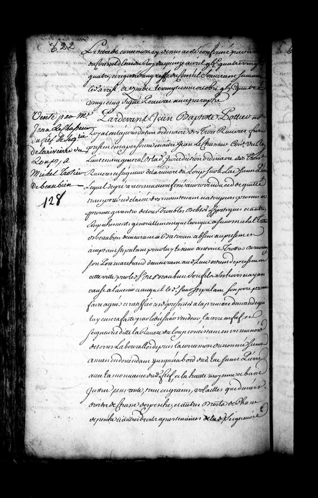 Contrat de vente par Maître Jean Lechasseur, conseiller du Roi, lieutenant général des Trois-Rivières, seigneur de la Rivière-du-Loup sur le lac Saint-Pierre, au sieur Antoine Trottier Des Ruisseaux (Desruisseaux), de Batiscan, stipulant pour Michel Trottier Beaubien, son fils, marchand, de la terre, fief et seigneurie de la Rivière-du-Loup (Notaire Jean-Baptiste Pottier)