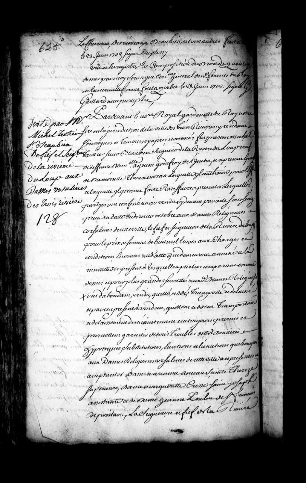 Contrat de vente par Michel Trottier, sieur de Beaubien, seigneur de la Rivière-du-Loup, veuf de damoiselle Agnès Godefroy de Linctot, aux Dames Ursulines des Trois-Rivières de la seigneurie et fief de la Rivière-du-Loup (Notaire Pierre Petit dit Gobin), 6 mars 1723, Archives nationales à Québec, Fonds Intendants, (03Q,E1,S4,SS1,D144,P6).