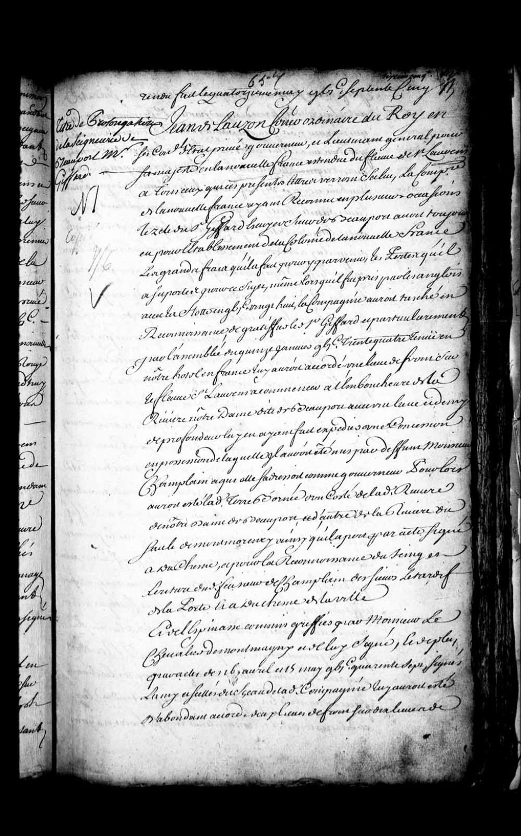 Acte de concession par Jean de Lauzon, gouverneur et lieutenant général pour Sa Majesté en la Nouvelle-France, au sieur Giffard, écuyer, seigneur de Beauport, de deux lieues et demie de profondeur sur la lieue de front de ladite seigneurie de Beauport, bornée par la rivière de Notre-Dame de Beauport d'un côté, ladite rivière étant comprise, et par la rivière du Saut de Montmorency de l'autre, pour en jouir par lui en pleine propriété, justice et seigneurie, avec tels et pareils droits que pour la seigneurie de Beauport, laquelle ne faisant plus qu'une seule seigneurie avec la présente concession