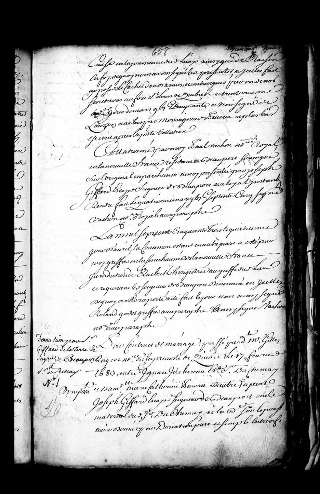Contrat de mariage entre Ignace Juchereau, sieur Duchesnay, d'une part, et damoiselle Marie-Catherine Peuvret, d'autre part, par lequel contrat Joseph Giffard, oncle maternel du sieur Duchesnay, donne par donation pure et simple et entre vifs audit Duchesnay et à ladite Marie-Catherine Peuvret, en faveur de leur mariage, la terre, fief et seigneurie de Beauport, ainsi que le tout lui appartenait par la donation qui lui en avait été faite par Robert Giffard et Marie Renouard (Regnouard), ses père et mère (Notaire Gilles Rageot)