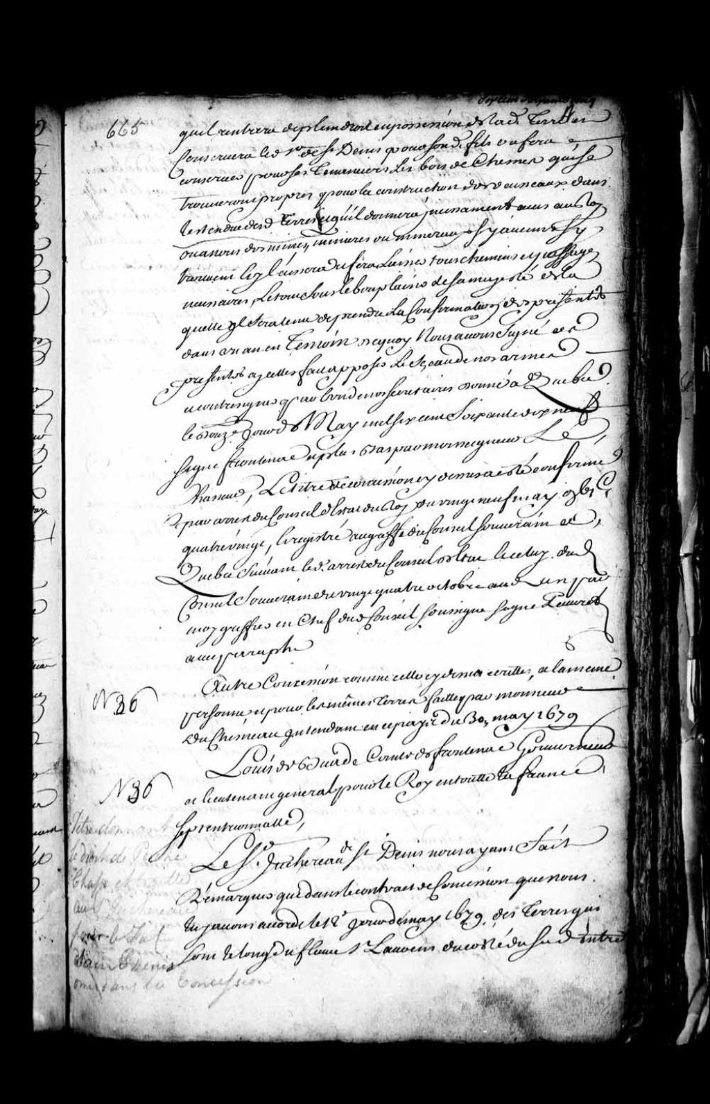 Ratification par arrêt du Conseil d'État du Roi de la concession accordée à Nicolas Juchereau de Saint-Denys (Saint-Denis), au nom de Joseph Juchereau, son fils, d'une étendue de terre le long du Saint-Laurent entre les terres des sieurs de La Durantaye (LaDurantaye) et La Bouteillerie (LaBouteillerie), laquelle concession ayant été accordée le 12 mai 1679 par messires de Frontenac et Duchesneau, gouverneur et intendant en Nouvelle-France, 29 mai 1680, Archives nationales à Québec, Fonds Intendants, (03Q,E1,S4,SS1,D155,P2).