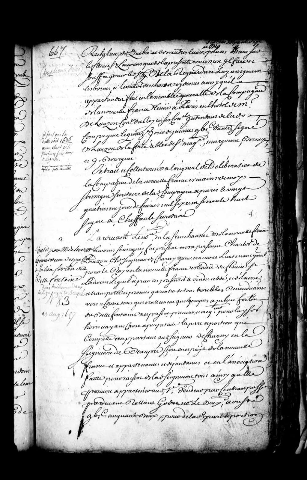 Contrat de vente par Charles de Lauzon, seigneur de Charny, gouverneur et lieutenant général pour le Roi en la Nouvelle-France, à Julien Fortin dit Bellefontaine de la part et portion qui lui appartient en la seigneurie de l'île d'Orléans, appartenances et dépendances, lui appartenant par contrat passé le 2 août 1657 devant le notaire Rolland Godet (Notaire Louis Rouer de Villeray), 23 août 1657, Archives nationales à Québec, Fonds Intendants, (03Q,E1,S4,SS1,D157,P2).