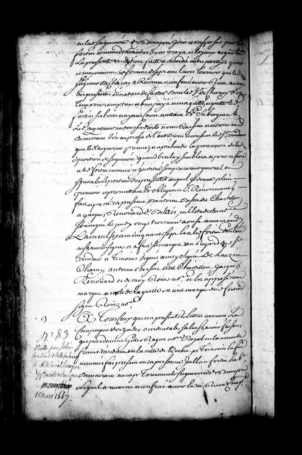 Quittance de Julien Fortin, habitant, demeurant au Cap-Tourmente, en faveur de monseigneur de Laval, évêque de Pétrée, quant au paiement reçu par lui pour la vente de la huitième partie de la seigneurie de Beaupré par lui consentie le 11 février 1662 (Notaire Gilles Rageot), 18 mars 1667, Archives nationales à Québec, Fonds Intendants, (03Q,E1,S4,SS1,D157,P3).