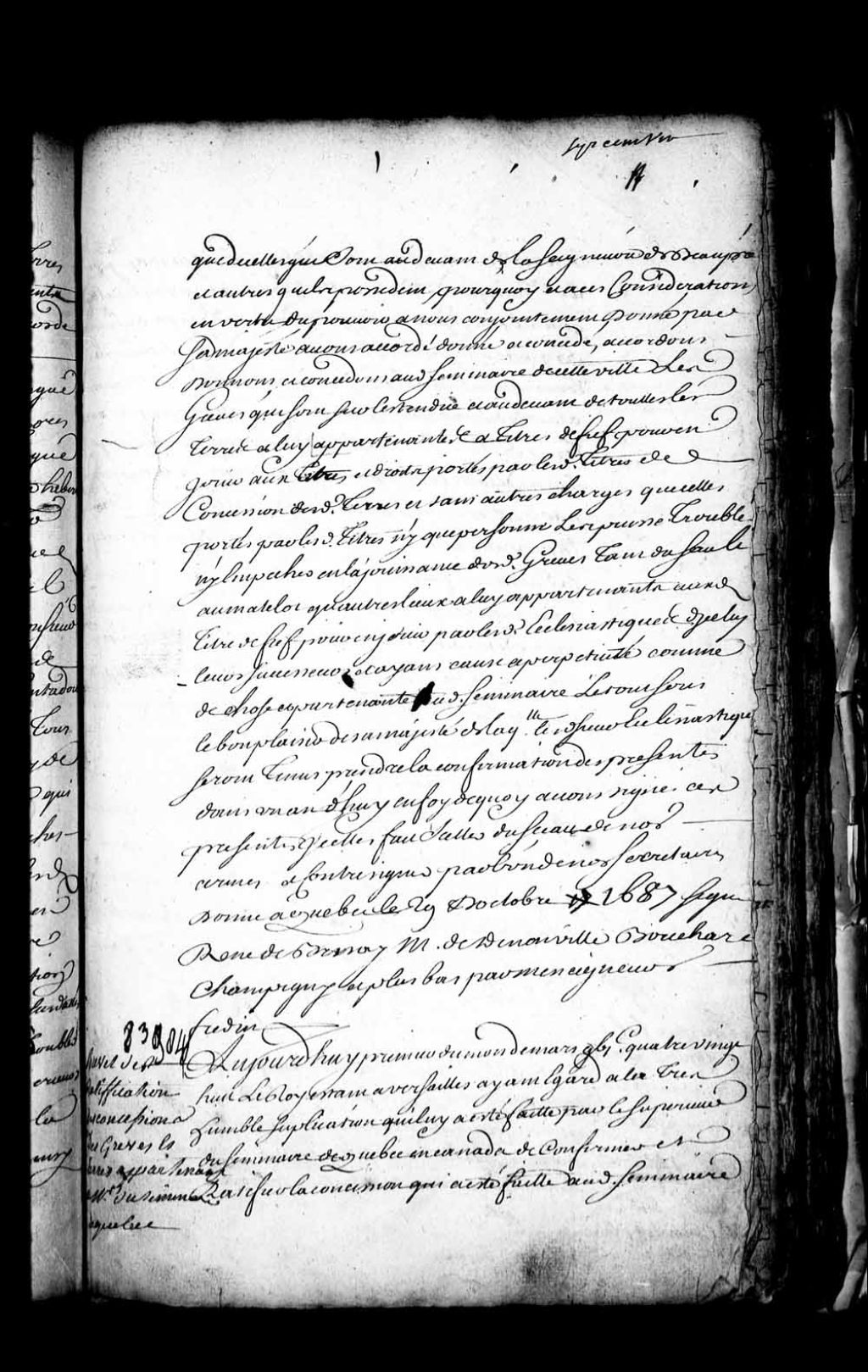 Brevet de confirmation par Sa Majesté des droits de grève accordés au Séminaire de Québec le 29 octobre 1687 par le Marquis de Denonville et Jean Bochart Champigny, gouverneur et intendant de la Nouvelle-France