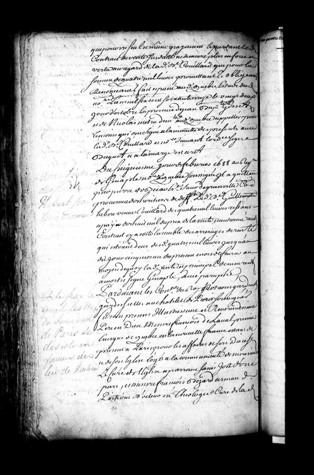 Quittance générale de Pierre de Bécard de Grandville (Granville), au nom et comme procureur de Paul Dupuy (Dupuis), curateur à la succession vacante de feu Louis Couillard de Lespinay (L'Espinay), de Charles Aubert de la Chesnaye (LaChesnaye, Lachenaie), pour le sieur Aubert, son fils, de damoiselle Marie Couillard, veuve du sieur Macart (Macard), de Jacques de Lalande de Gayon, à cause de damoiselle Marie Couillard, sa femme, de Charles Couillard de Beaumont et de Jean Guyon du Buisson, à cause d'Élisabeth Couillard, sa femme, tous héritiers de feue dame Marie-Guillemette Hébert, veuve du sieur Couillard, en faveur de messire Louis Ango des Maizerets, supérieur du Séminaire de Québec, étant aux droits de monseigneur de Laval, pour la vente consentie par ladite feue dame Marie-Guillemette Hébert, veuve Couillard, à monseigneur de Laval le 10 avril 1666 et passé par contrat devant le notaire Romain Becquet (Notaire François Genaple de Bellefonds)