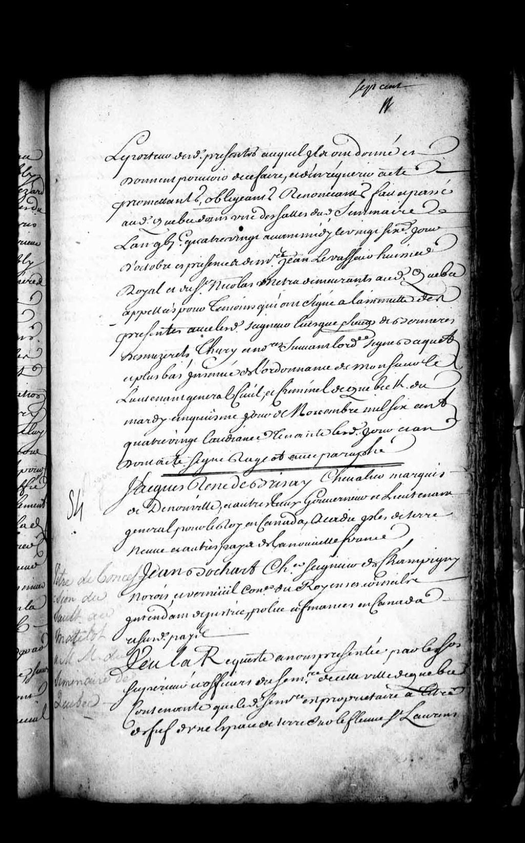 Acte de concession par Jacques-René de Brisay, Marquis de Denonville, et Jean Bochart Champigny, gouverneur et intendant de la Nouvelle-France, au Séminaire de Québec des grèves qui sont sur l'étendue et au-devant de toutes les terres leur appartenant, pour en jouir aux mêmes clauses et charges portées par les titres de concession originaux desdites terres, sans que personne ne puisse les troubler ou empêcher en la jouissance desdites grèves, tant du Sault-au-Matelot qu'autres lieux, à titre de fief