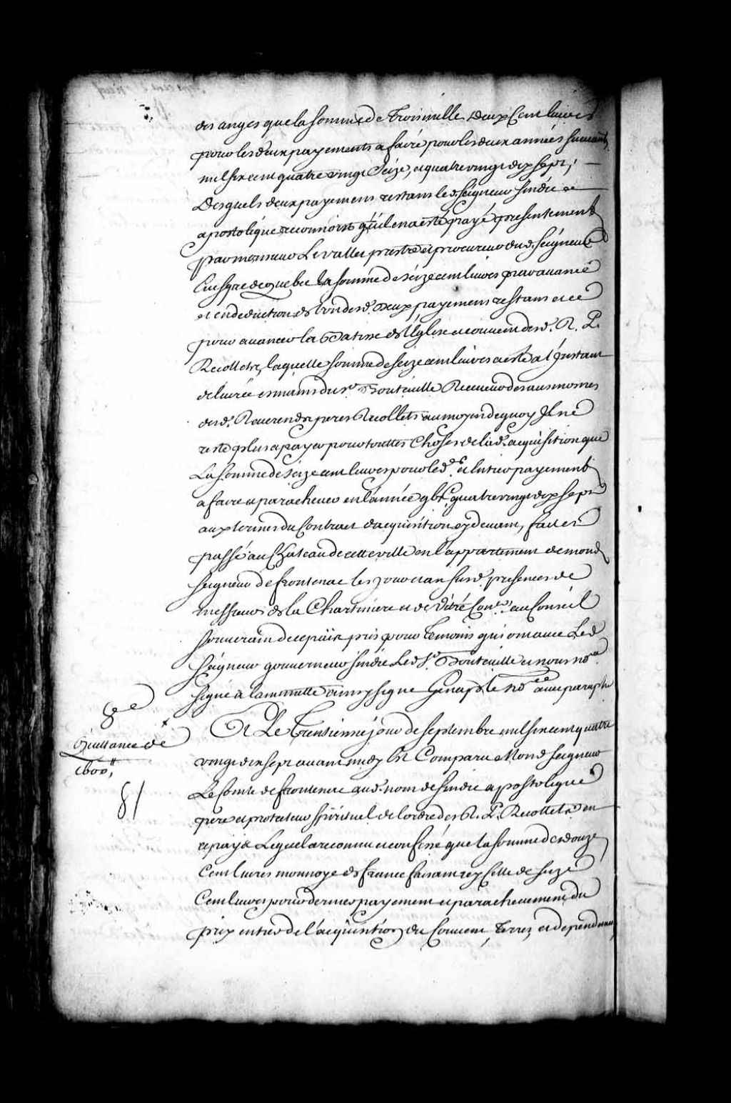Quittance partielle de monseigneur le Comte de Frontenac, syndic des Pères Récollets, en faveur de monseigneur de Saint-Vallier pour le paiement du prix des terres et du couvent de Notre-Dame-des-Anges, achetés aux Récollets selon le contrat de vente passé le 13 septembre 1692 devant François Genaple de Bellefonds (Notaire François Genaple de Bellefonds), 30 septembre 1697, Archives nationales à Québec, Fonds Intendants, (03Q,E1,S4,SS1,D161,P12).